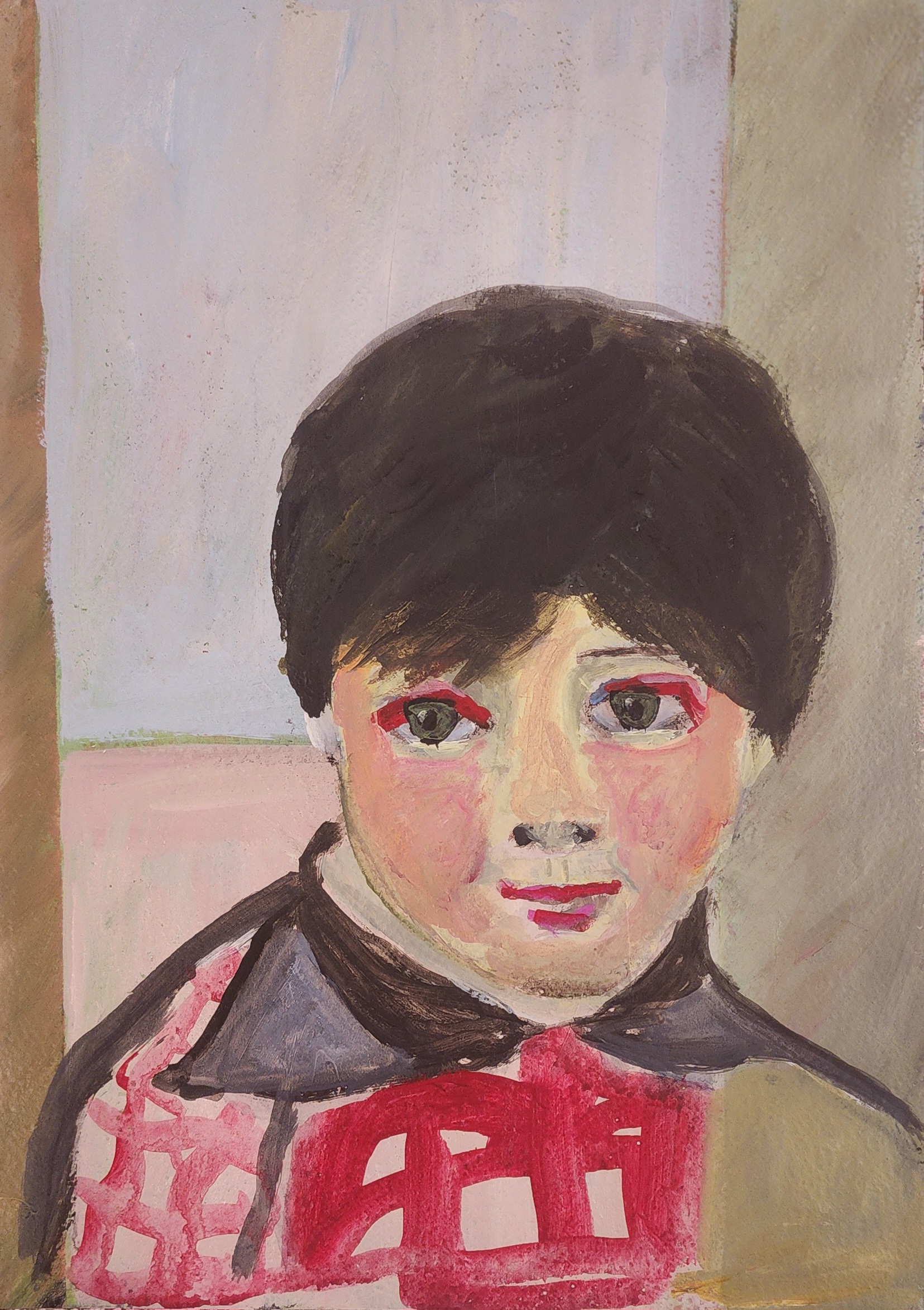 A dreamlike portrait with a haunting gaze, where innocence and fire quietly meet,