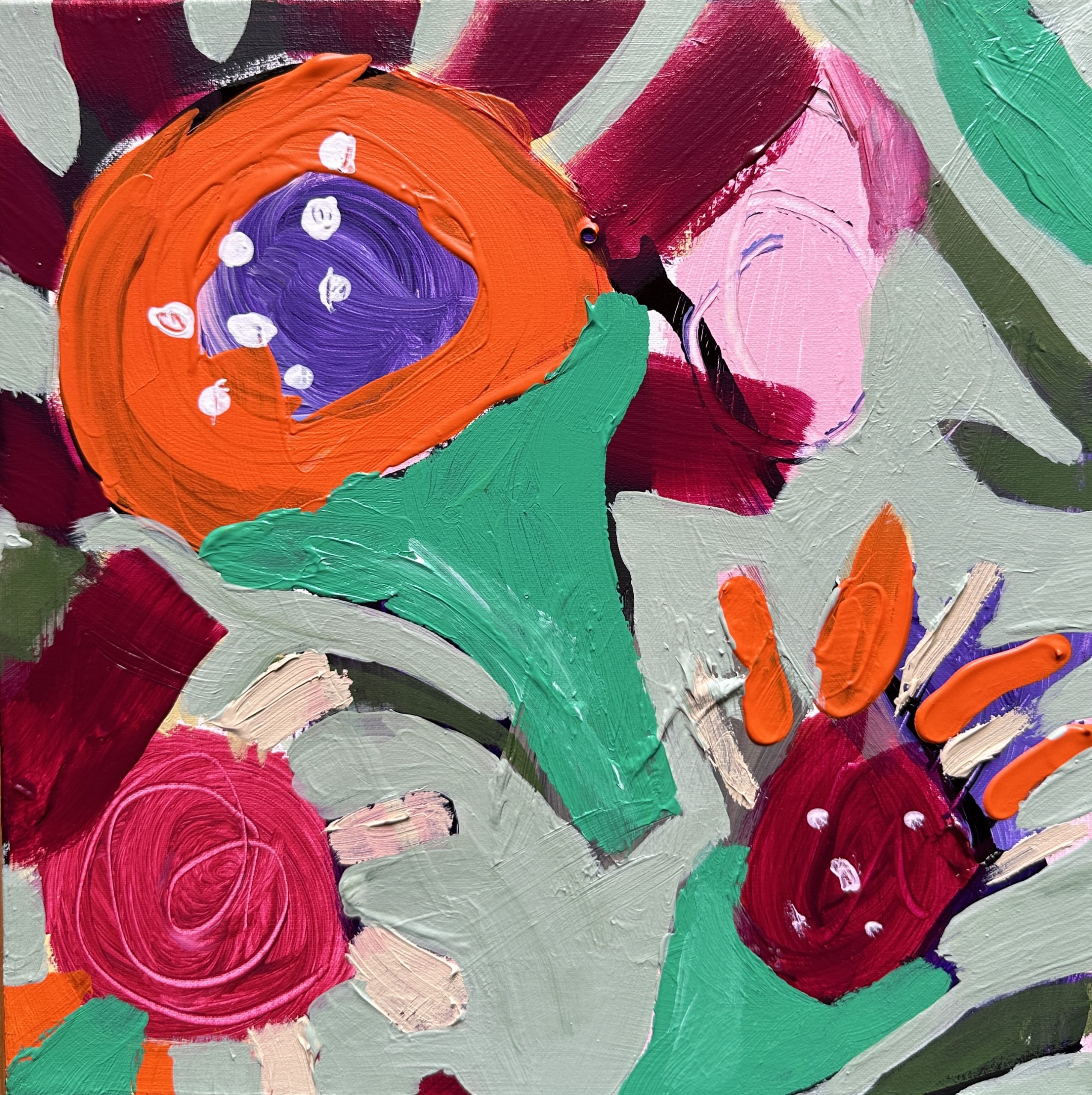 This piece captures the essence of nature’s vibrancy in an abstract form, full of life and spontaneity on canvas.