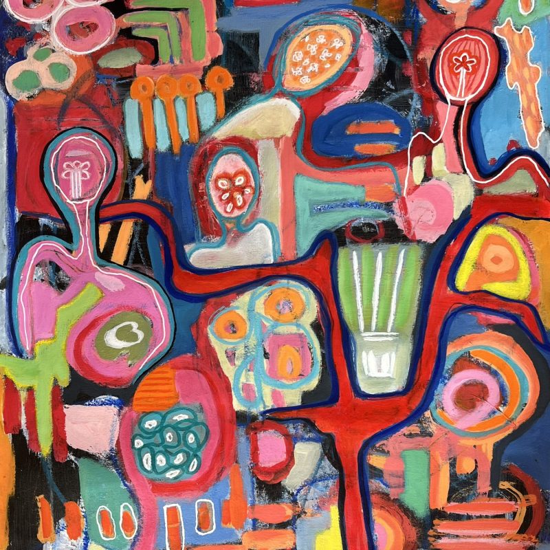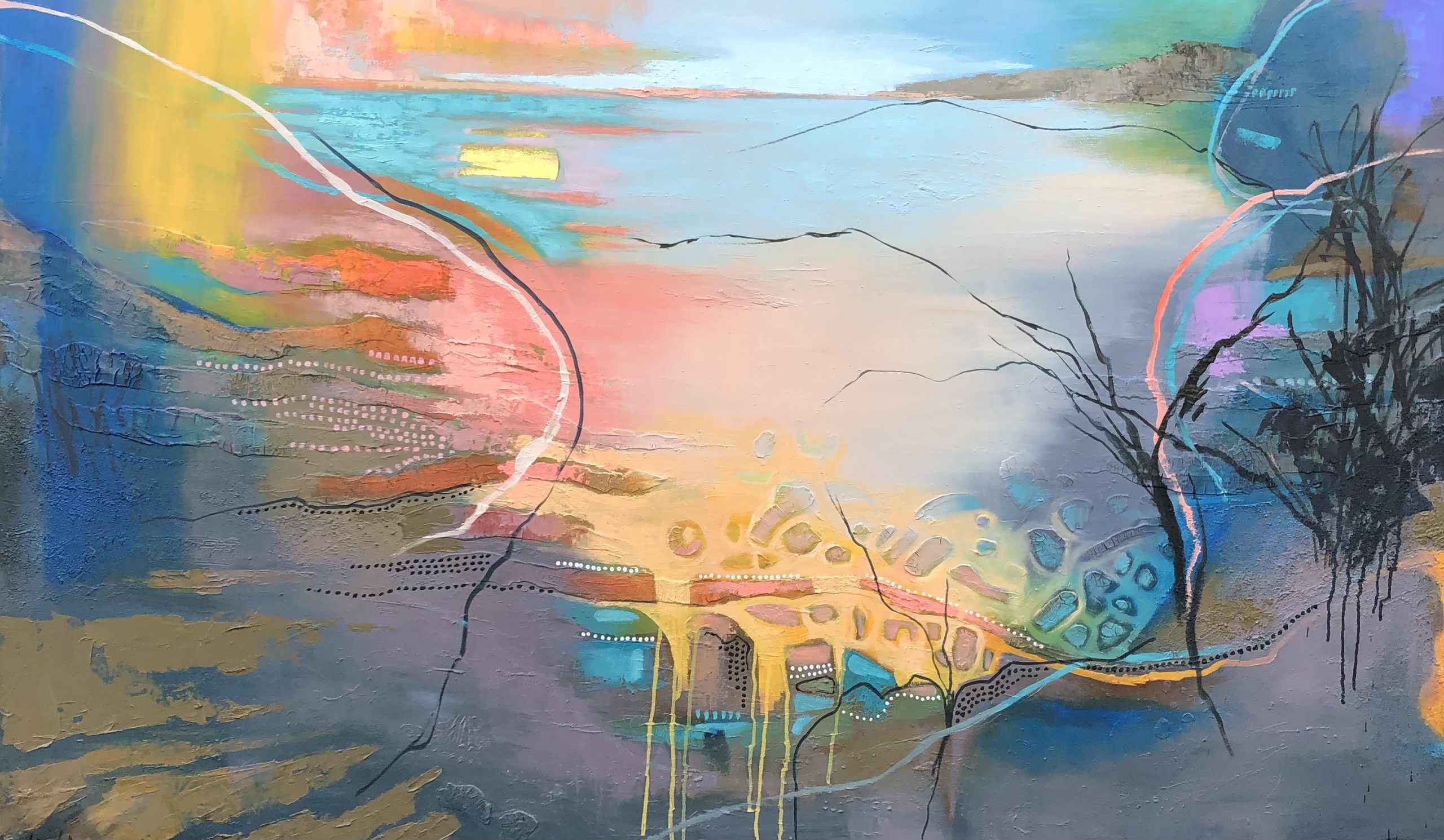 The materials used are – texture Gel, acrylic inks, acrylic paints and oil paints. The acrylic paint is always the first layer before the final layer of oil paint.