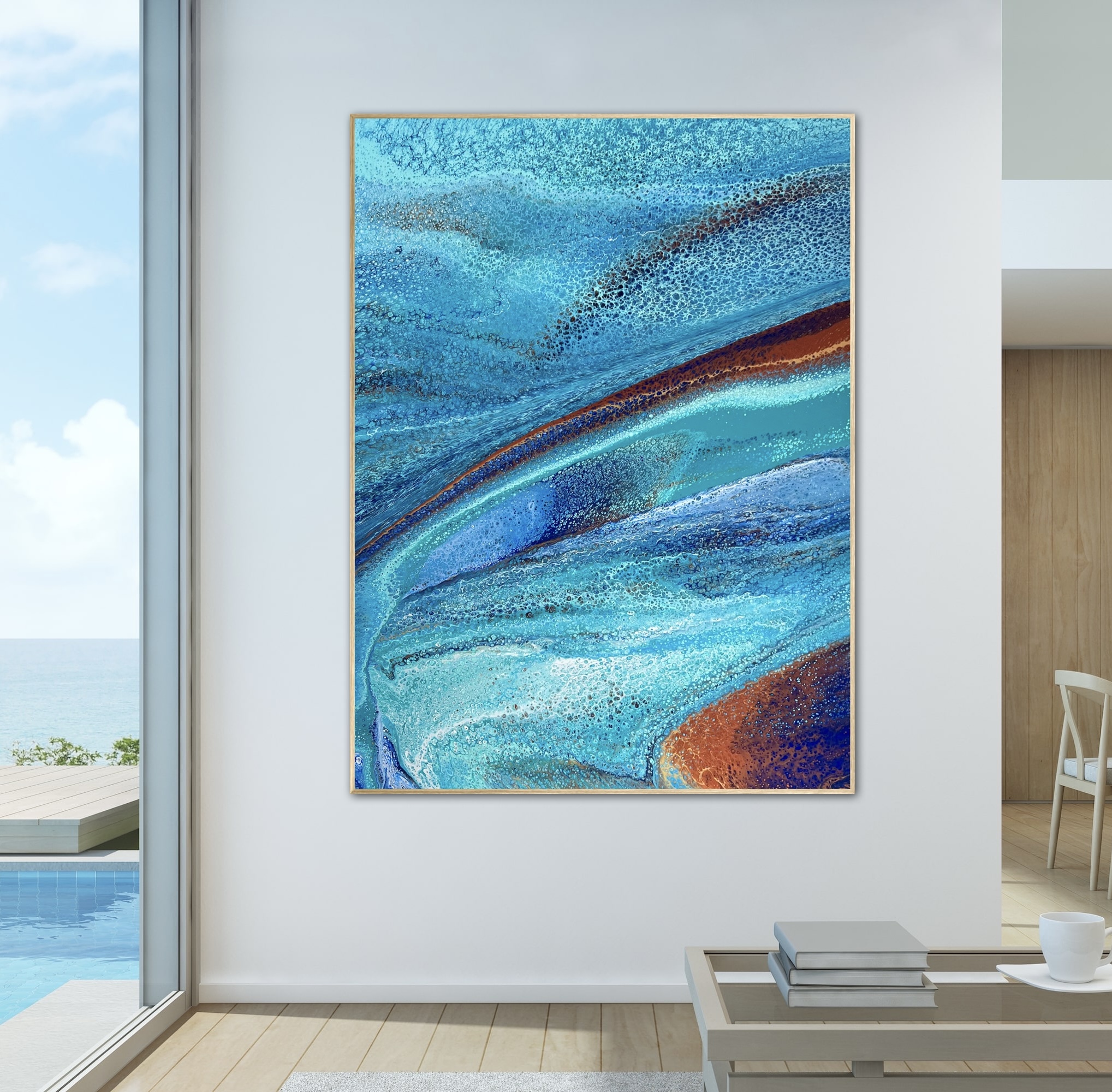 Below the Surface was created using various techniques combined to allow increased flow, interaction and separation of colours to create interesting patterns where pops of colour can be seen emerging from underneath. This added dimension adds lace and cells to the artwork creating an interesting and one of a kind painting that can never be replicated. The metallic paint used reflects the shifting light beautifully really bringing the painting to life.