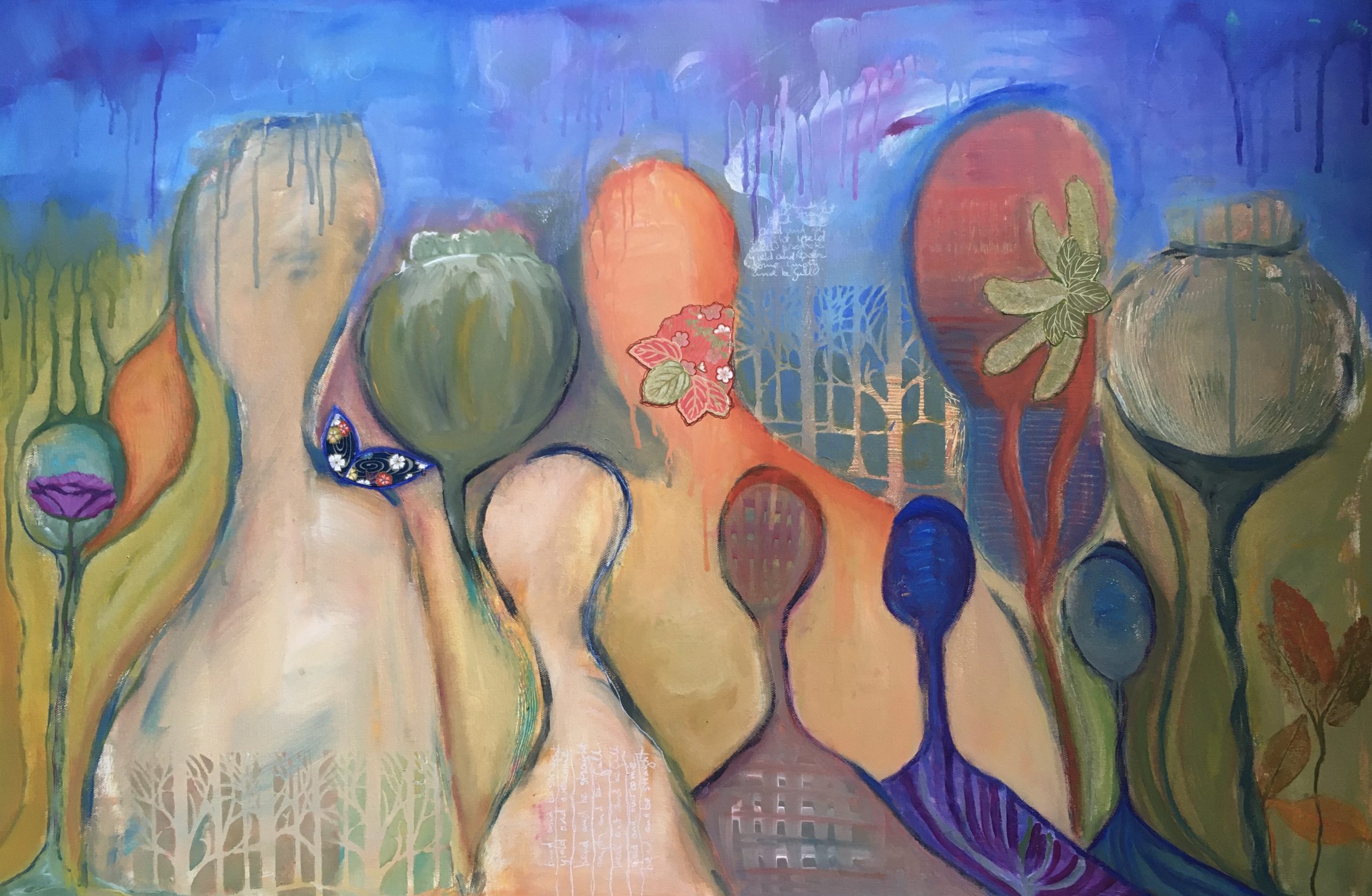 Original mixed media artwork with acrylic paint and collage on stretched canvas