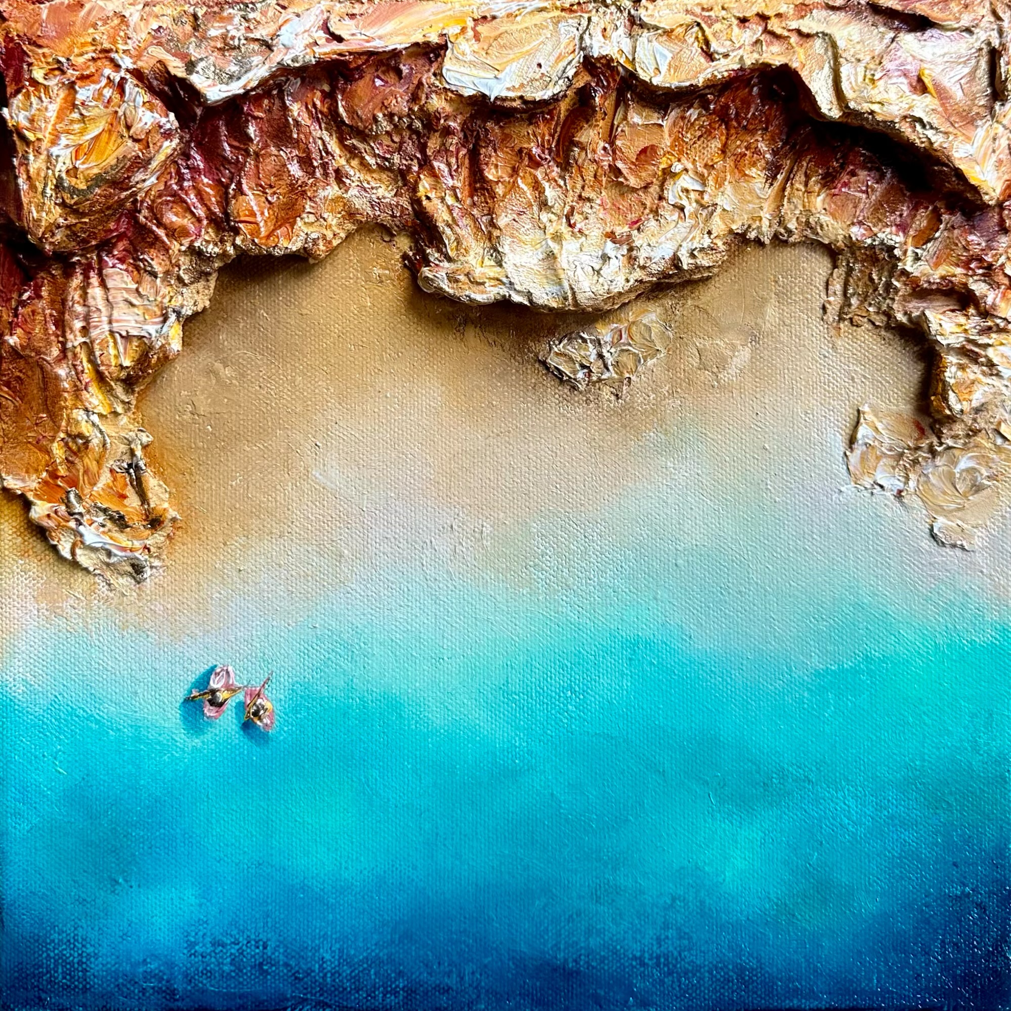 Half Moon Bay is a stunning hidden gem in Melbourne. Every time I visit, it feels like I’ve been transported to another country. The breathtaking rock cliffs, glowing in deep orange, red, and yellow tones, are truly striking. The crystal-clear ocean, contrasting with these cliffs, is a constant source of inspiration that I couldn’t resist capturing on canvas. The presence of kayakers, fishermen, and paddleboarders adds to the vibrant atmosphere of this beautiful location.