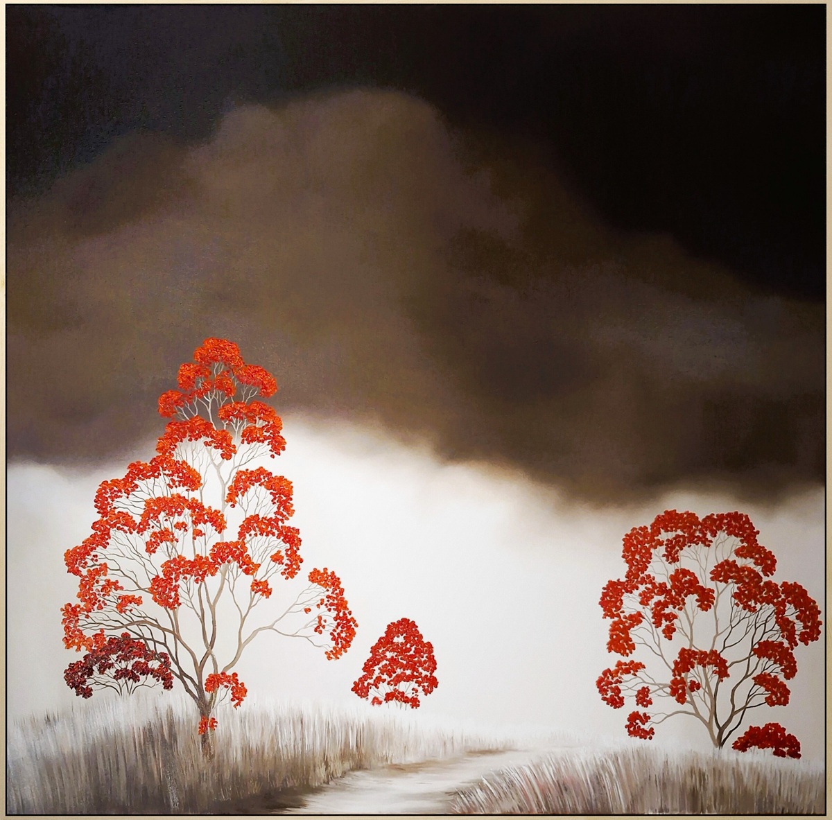 Beneath The Heavy Sky by Lucinda Leveille captures an atmosphere that is at once haunting and beautiful, immersing the viewer in a landscape where contrasts dominate. At first glance, the composition is striking: a broad expanse of dark, almost suffocating clouds spreads across the upper half of the canvas, descending heavily upon the land below. Yet beneath this brooding sky, bursts of vibrant red foliage emerge, painted with precision and vividness, standing out against the muted background. The balance between darkness and brightness, despair and vitality, creates a narrative that feels deeply human and timeless.