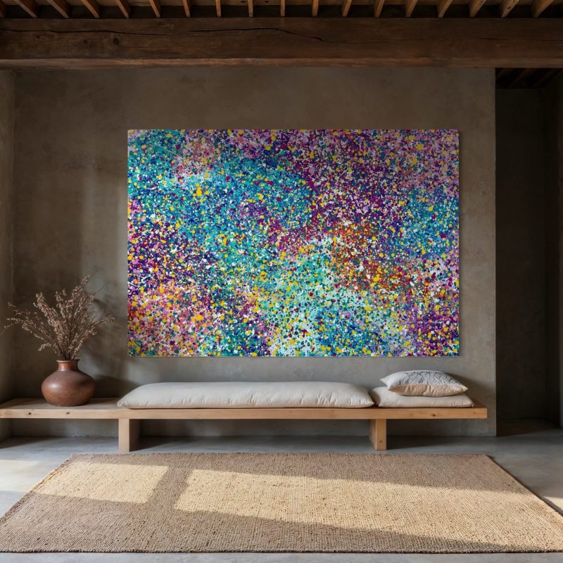It’s large and full of energy, layered textures, and pops of colour that flow across the canvas like an ocean garden in motion. Big, bright, and a little bit whimsical, this piece celebrates the beauty of life beneath the surface — with a few surprises along the way.