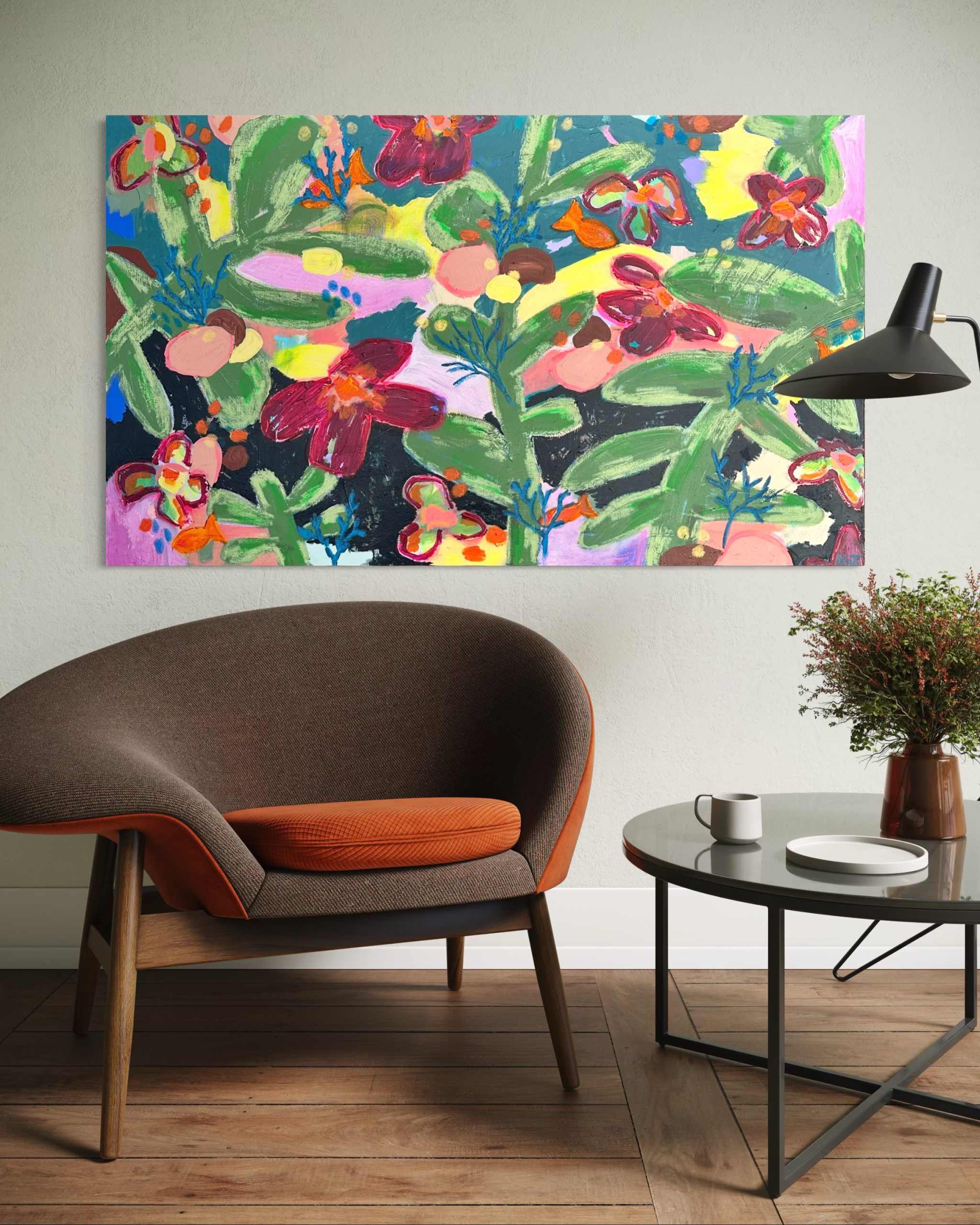 Beneath the Seaweed is a bold and vibrant artwork that dives into a colourful underwater world where seaweed, fish, and flowers all come together in a playful mix.