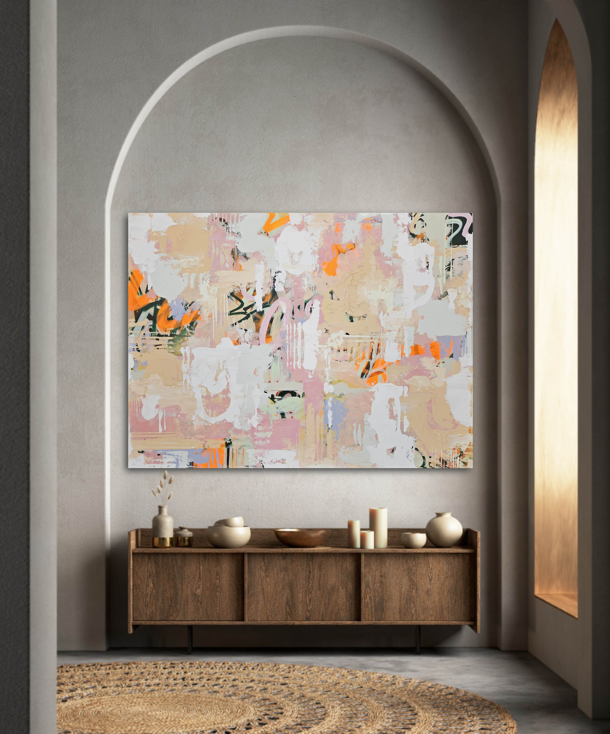 This large-scale abstract artwork is inspired by the urban decay of old peeling graffiti walls.