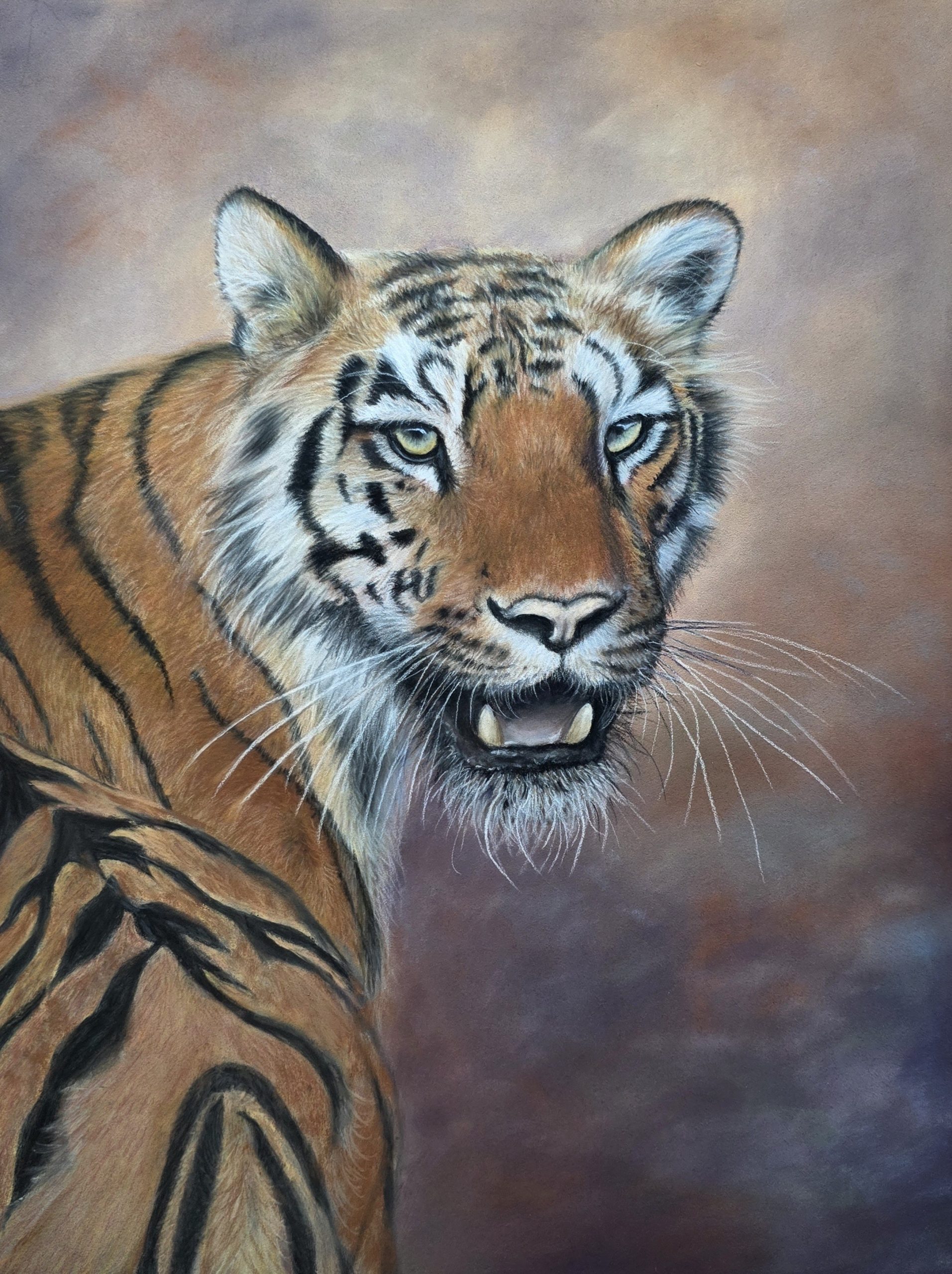Painting such a magnificent endangered creature, after spending time with them in India is a dream come true. I am inspired by wildlife and supporting conservation, bringing awareness through my work, so this was a very special experience for me. Tigers are such vulnerable animals and it was heart warming and thrilling to spend time with them on safari. To witness their strength and size was absolutely phenomenal and something I will remember forever! To capture the beauty on paper with soft pastel is something that will last a lifetime.