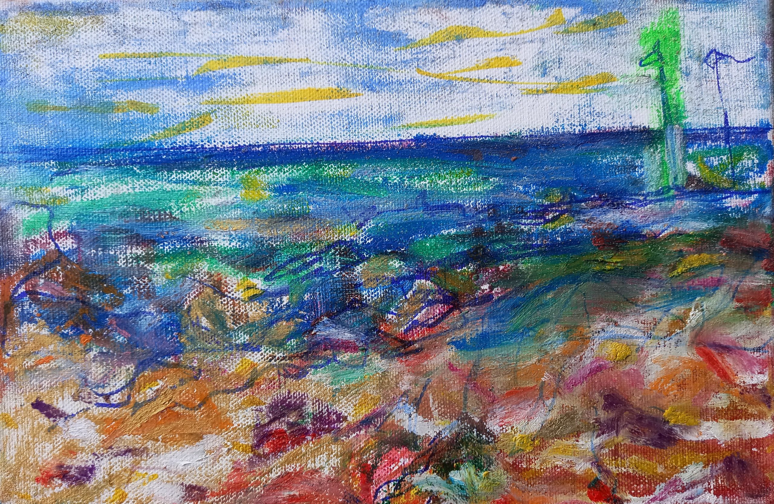 Created sitting in front of the ocean on a warm day, watching the interplay of light and colour, leading the eye outward to the horizon. Playfully created with lots of movement and colour, utilising marker with drawing, followed by oilstick which is made from oil paint. A dynamic combination portraying an atmospheric piece, expressing the way that I enjoy the ocean.