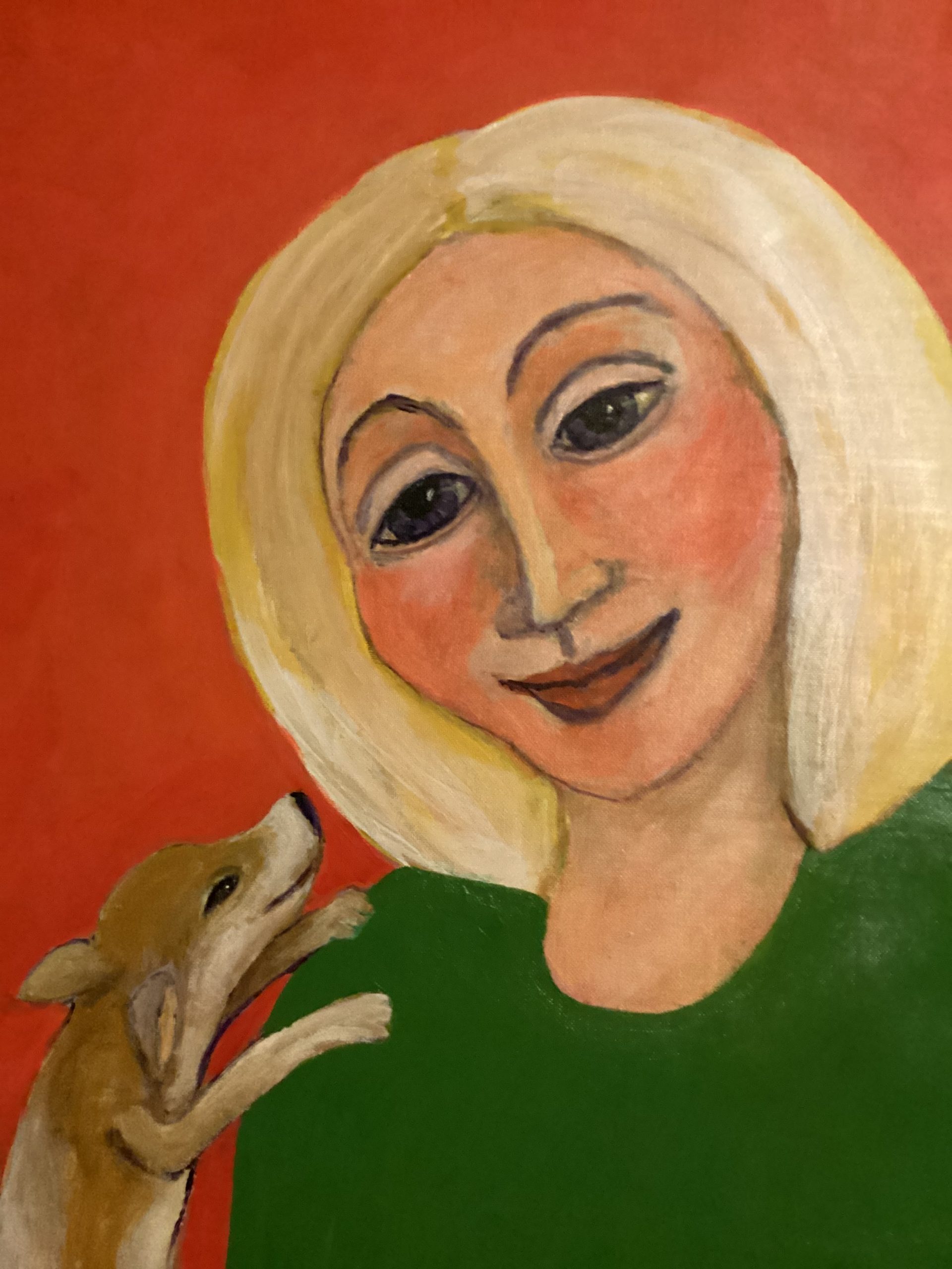 Best Friends by Margaret Connell is whimsical and colourful. Painted on primed Italian linen using acrylic paint and sealed with satin liquitex It is not framed or on a frame and will require framing to hang It is 54 cm wide and height is 64 cm This painting was inspired by experience of a wonderful relationship with a pet dog it is expressionistic and is influenced by colour theory