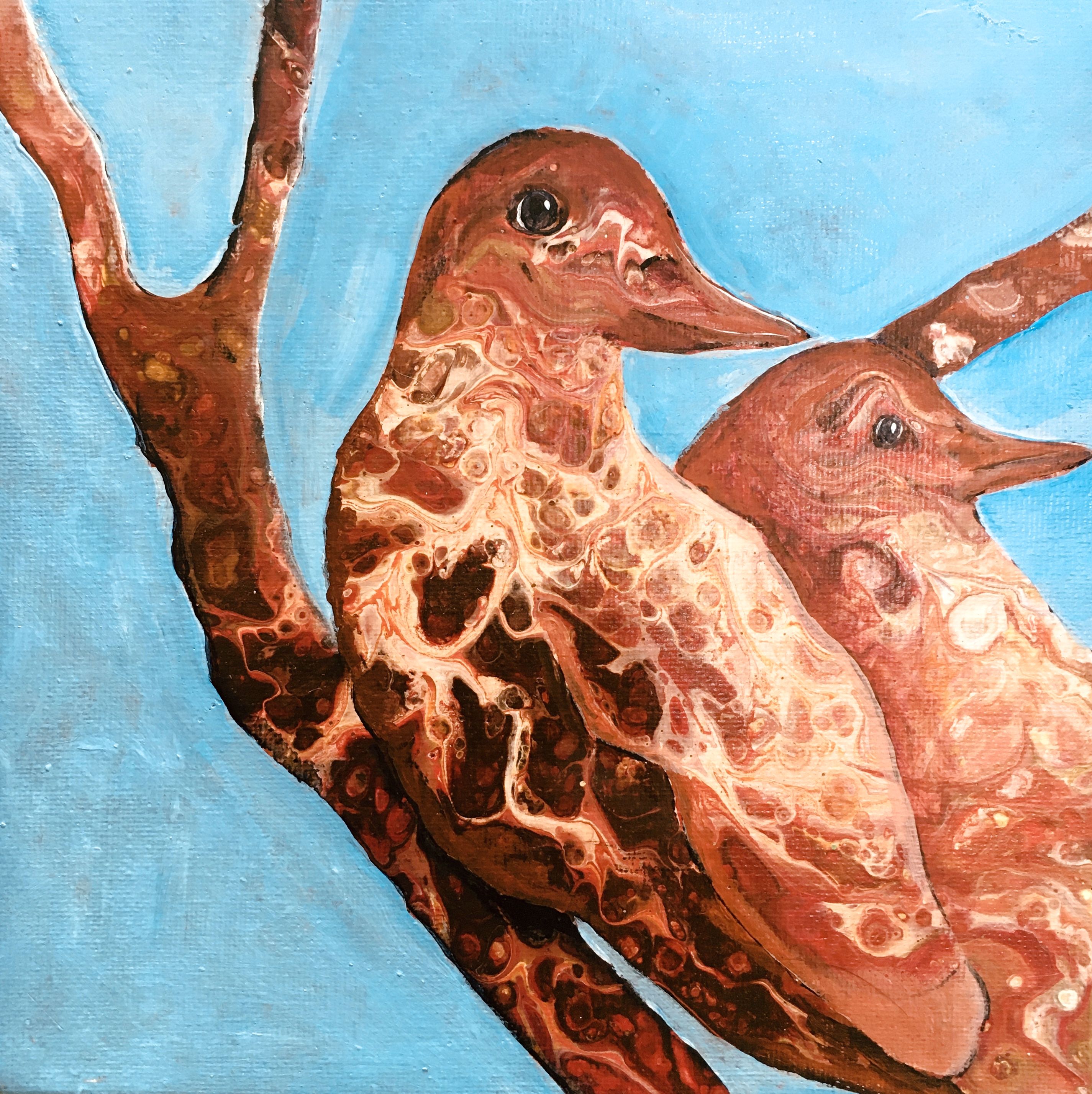 Best Mates started out as a fluid acrylic pour on canvas board. I enjoy finding shapes and new forms in my pours, but this time I was looking at the pour for a long time without seeing anything. And then, just as I walked past this little canvas, I suddenly I saw the main bird. It almost asked me to be freed and painted. After I sketched the bird, it just felt a bit loney and then I saw his best mate just sitting next to him.