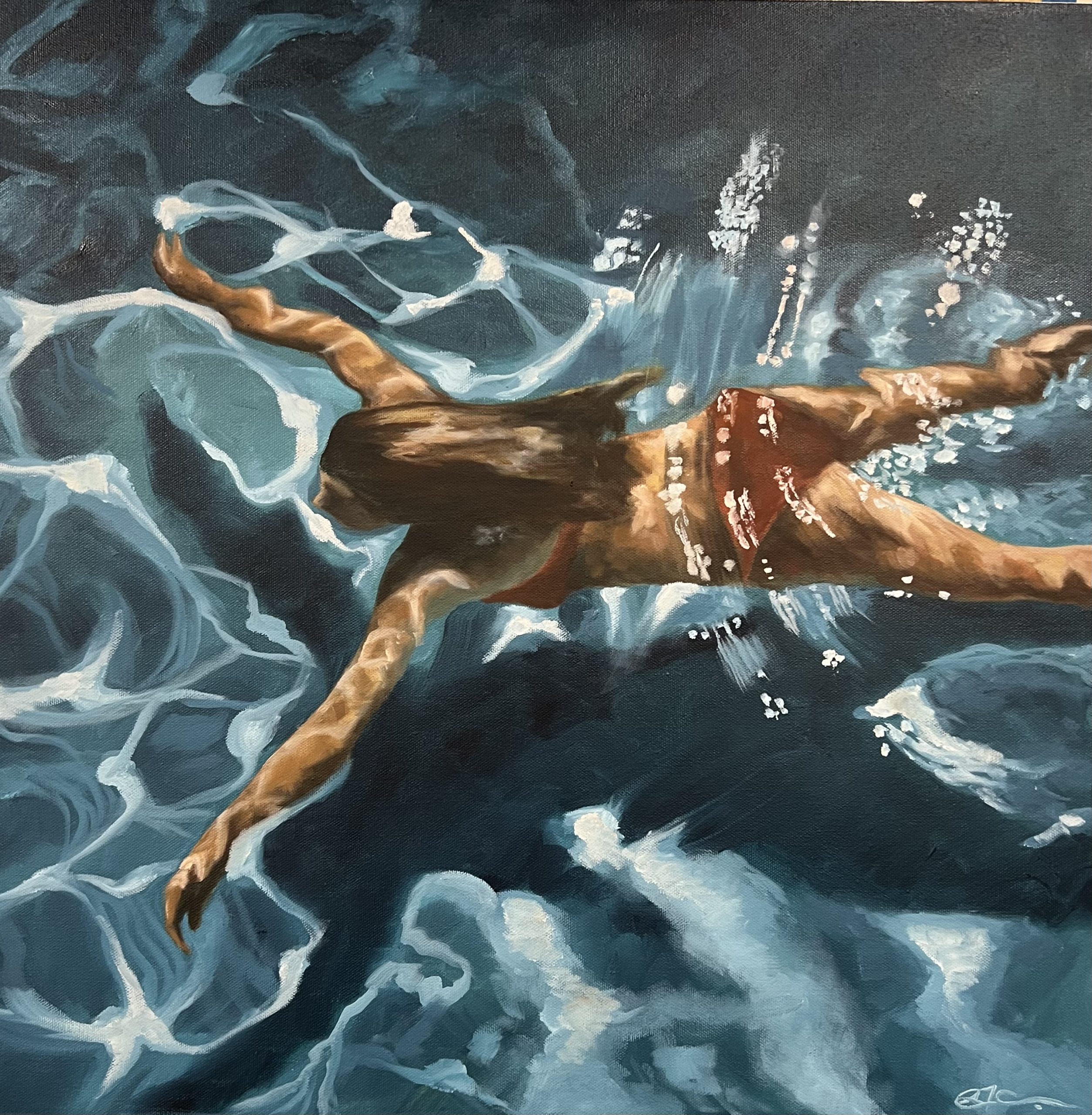 Between Worlds by Amanda Cameron – One of my ‘Summer Series’ of paintings and is an investigation into the interaction and connection between perspective, realism and colour. Amanda’s work is focused on the quest for finding refuge, quietness and escapism. Some [paintings] focus on the lone swimmer, the few minutes of introspection when submerged in the warm quiet of water, and others investigate the interaction of people within various aspects of the landscape. I haven’t settled on any particular style, and constantly struggle with the juxtaposition between hyper-realism and having a painterly quality to my art and this conflict in my paintings is what I am always trying to balance. This piece is painted in professional quality oil paints on a museum quality canvas, and finished with edges painted and a gloss varnish for protection. It comes ready to hang with a Tasmanian Oak floating box frame and includes a certificate of authenticity.