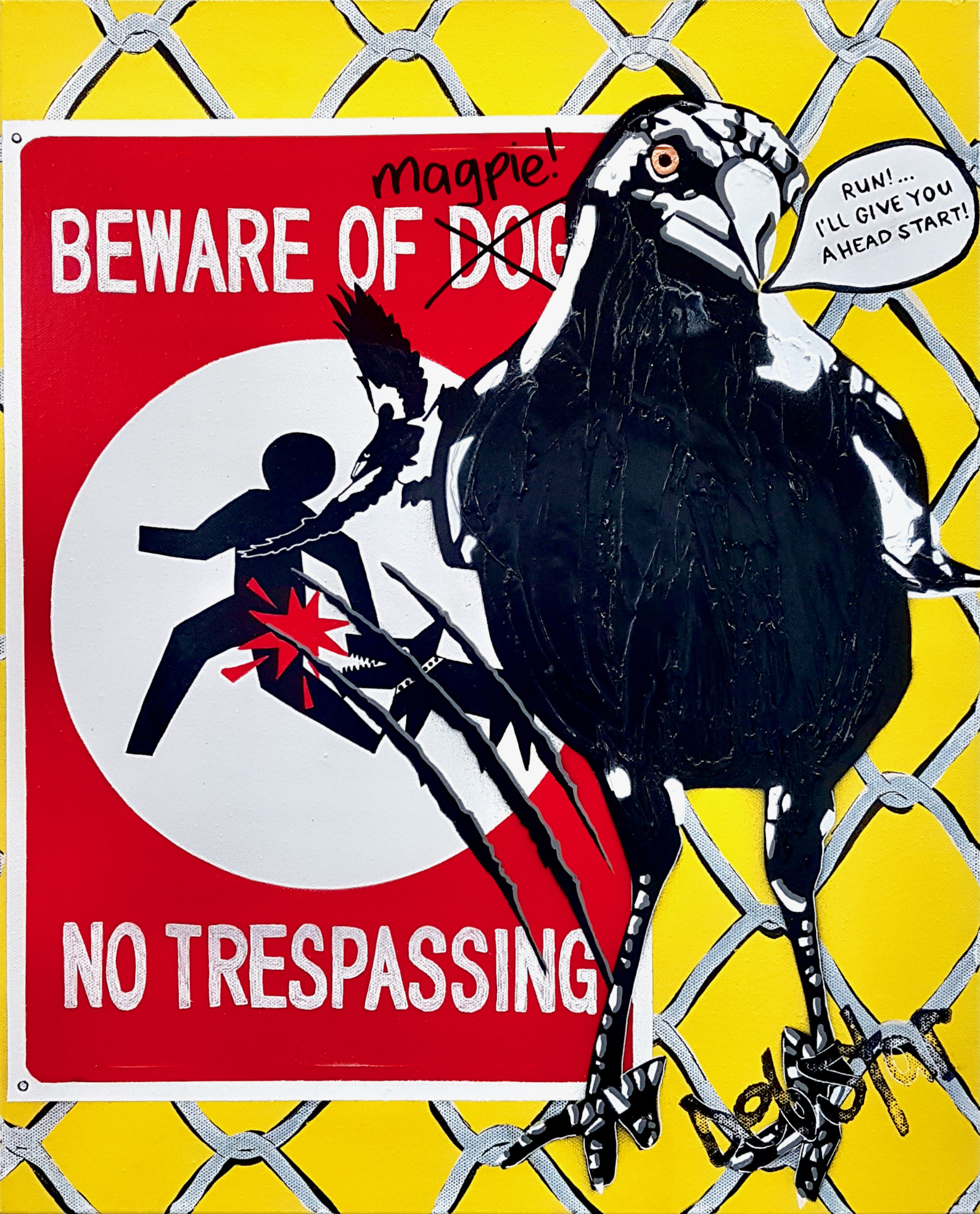 It has been created with stencils, layered upon a vibrant yellow base, featuring a street sign which has been altered poking fun at magpies, texture has been added to the birds body.