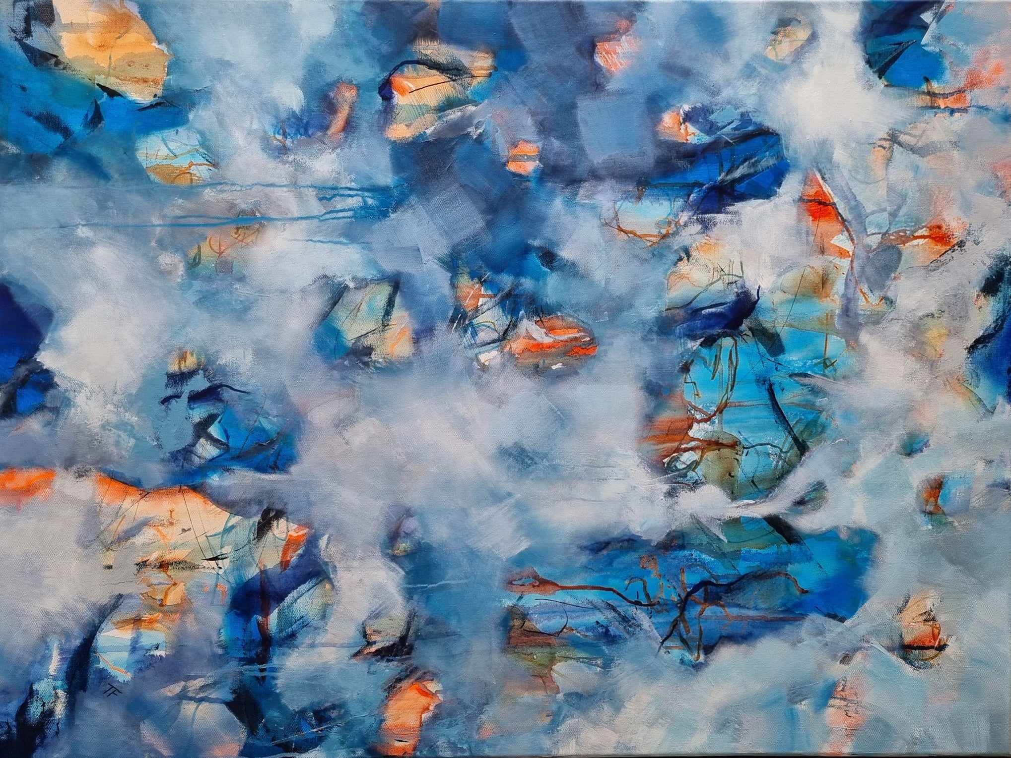 This original painting is created in many layers with high quality lightfast acrylic paint. These layers create the depth and lightness. It has an airy organic feel and a beautiful flow. It can be displayed both horizontally and vertically. The edges are painted in light grey to complement the painting. It’s signed on the front and on the back, varnished and ready to be displayed for years to come.