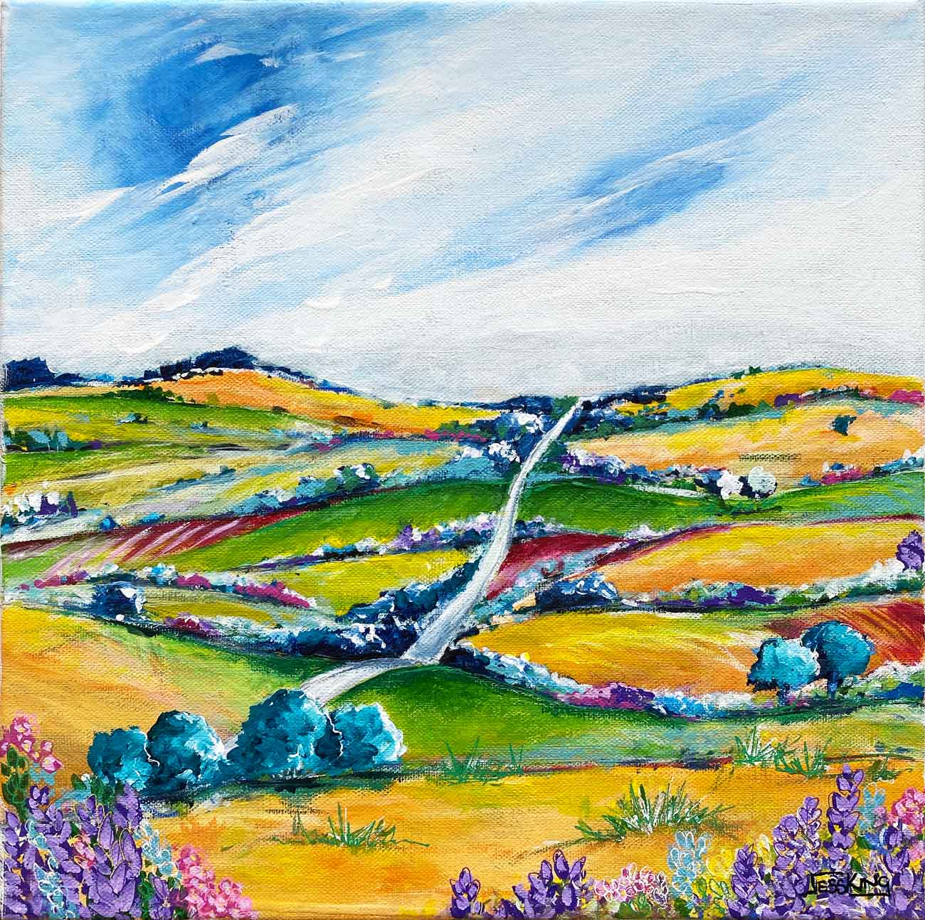 Inspired by a recent holiday to Rainbow Beach the rolling hills drew me in and I could feel the colours rolling into one another. The scenery on the journey was breath taking and this is my interpretation of the beauty of nature.