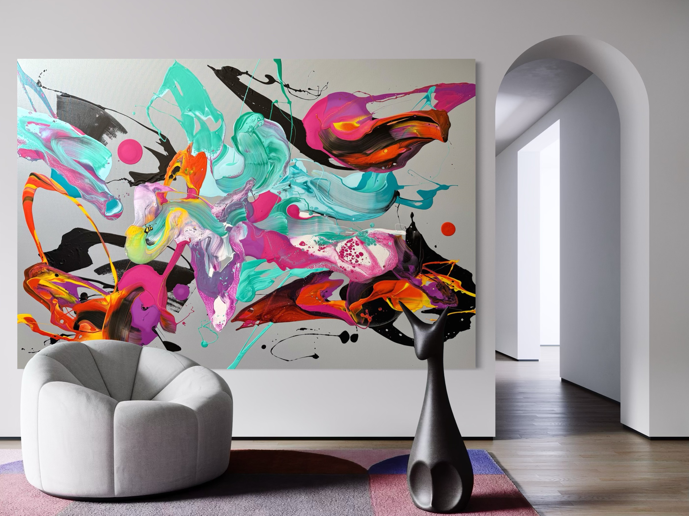 My new piece titled “Beyond the Narrative “displays a vivid burst of colour, this artwork captures the fluidity and joy of abstract forms with emphasis on movement