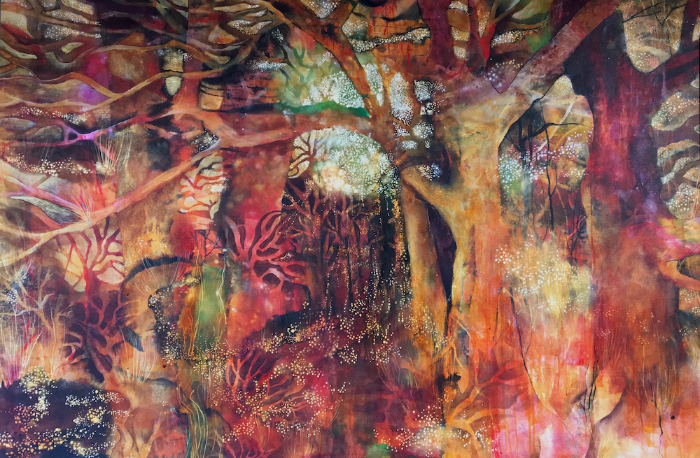 This large scale work is an investigation into colour vibrations. I am attempting to immerse the viewer in a colour bath, to create a sensation, curiosity and tranquility. This forest is a fantasy, an intuitive painting in the spirit of freedom and adoration of the Australian landscape….