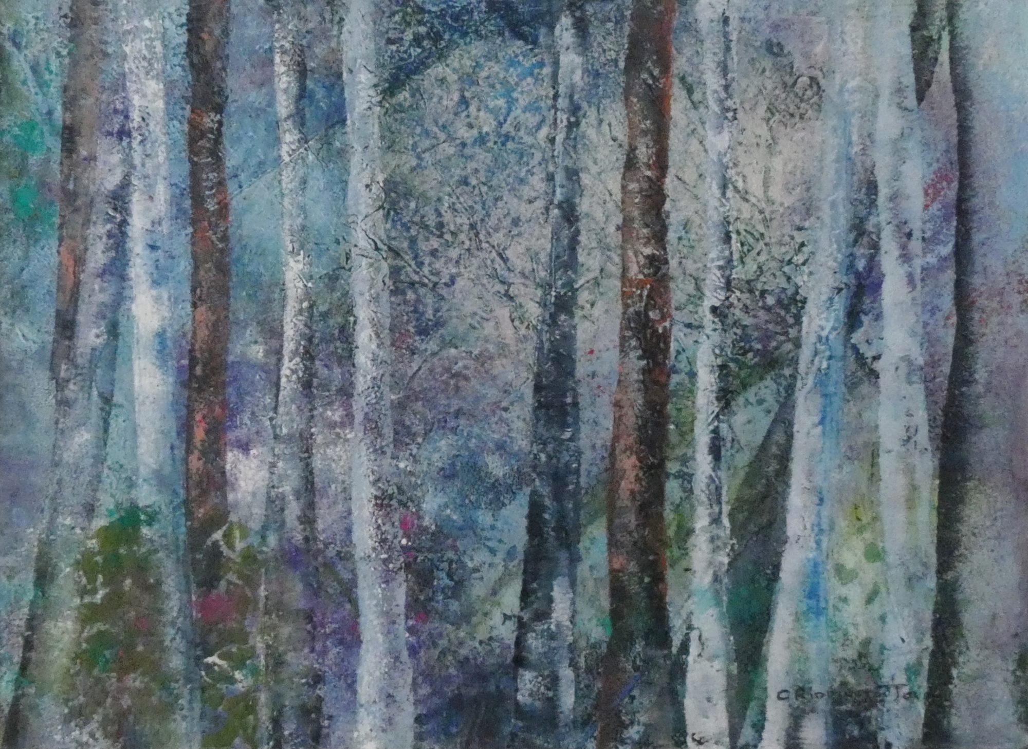 This is an Original Oil and Cold Wax painting on Arches Fine Art Paper and has a professional Art Mat surrounding it giving it a full dimension of 50cm x 40cm. It was inspired by my many walks in the surrounding forests and the wonderful light shining through the trees. It is a mixed media painting with many different materials used to make the marks which give the impression of a forest.