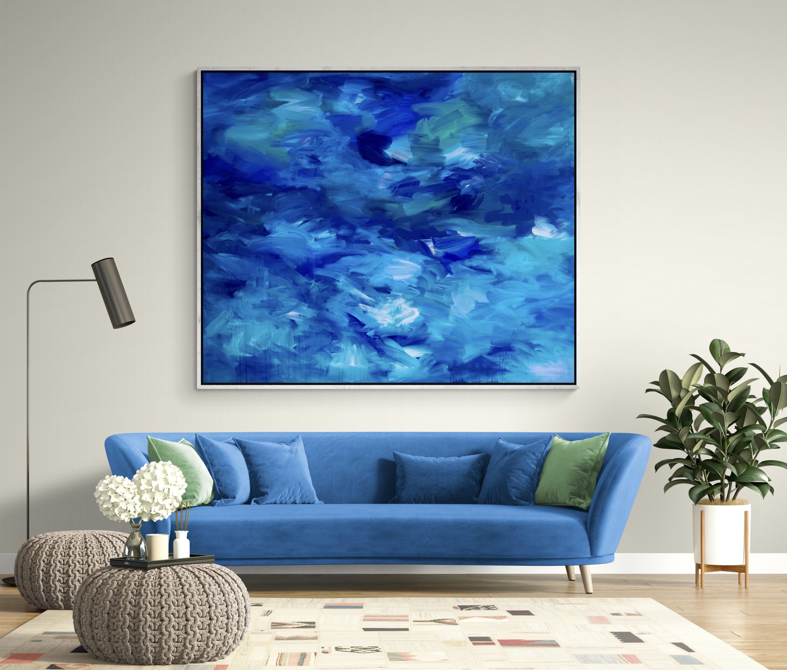 Big Blue by Theo Papathomas is a painting celebrating colour and light. A very soothing and tranquil painting where sky, sea come together to create this beautiful harmonious landscape. Capturing the beautiful blue cool colours of the sea painted very freely creating an abstract painting. Painted in a very expressionistic way with acrylic paints with lots of layers of paint and texture. I tried to create so much depth in the painting .A very harmonious composition of colours and forms that makes it a very poetic and meditating painting . The painting does not come with an external frame. The painting is signed and dated 2022 at the back and comes with a certificate of Authenticity.