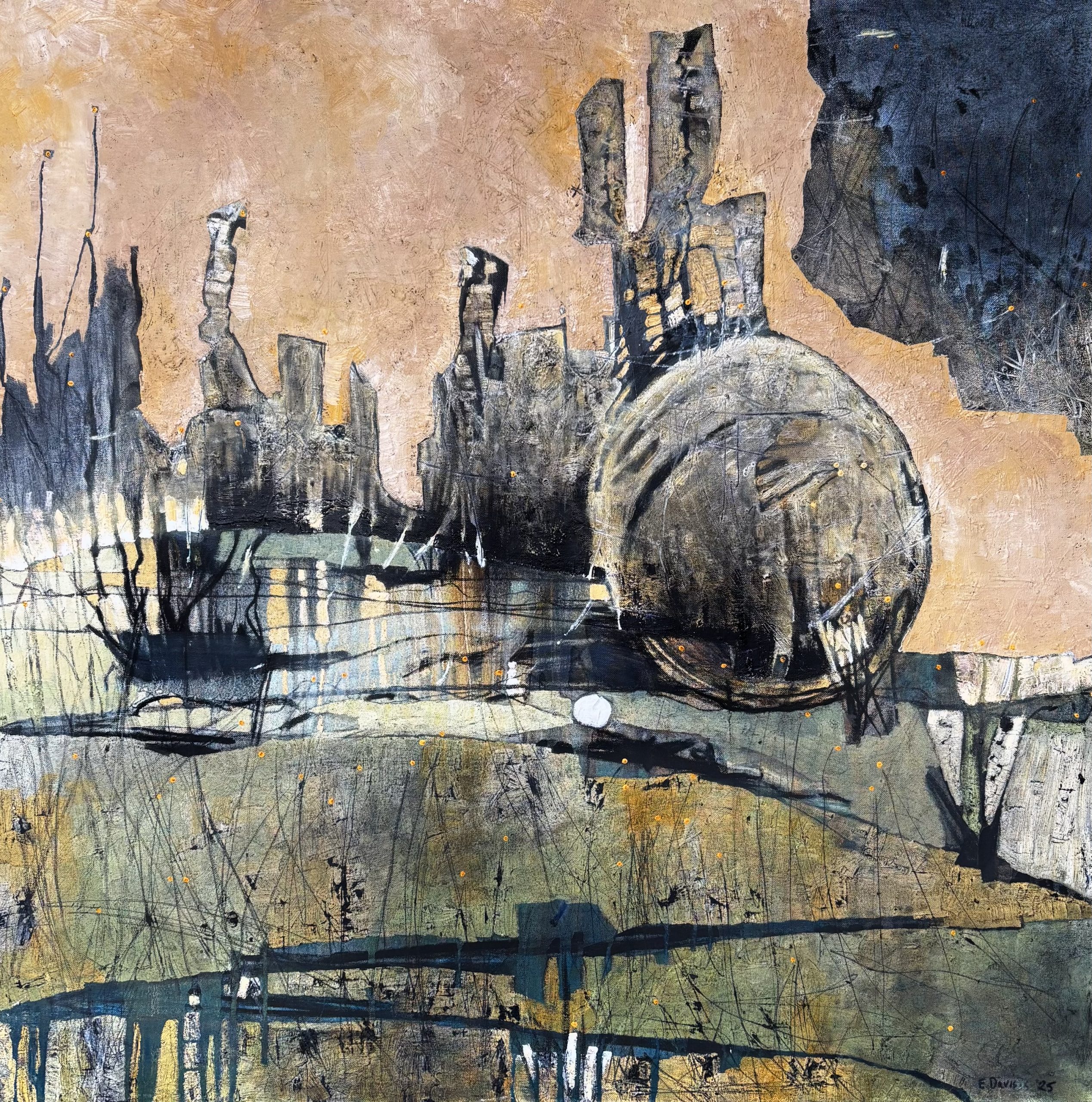 ‘Bully Buttons’ Original artwork by Erica Davis. Oil and charcoal on stretched canvas. 91x91cm. Unframed /ready to hang. A moody textural landscape with tiny vibrant yellow and orange flowers on soaring stems. Zoom in to highlight these tiny but mighty native flowers.