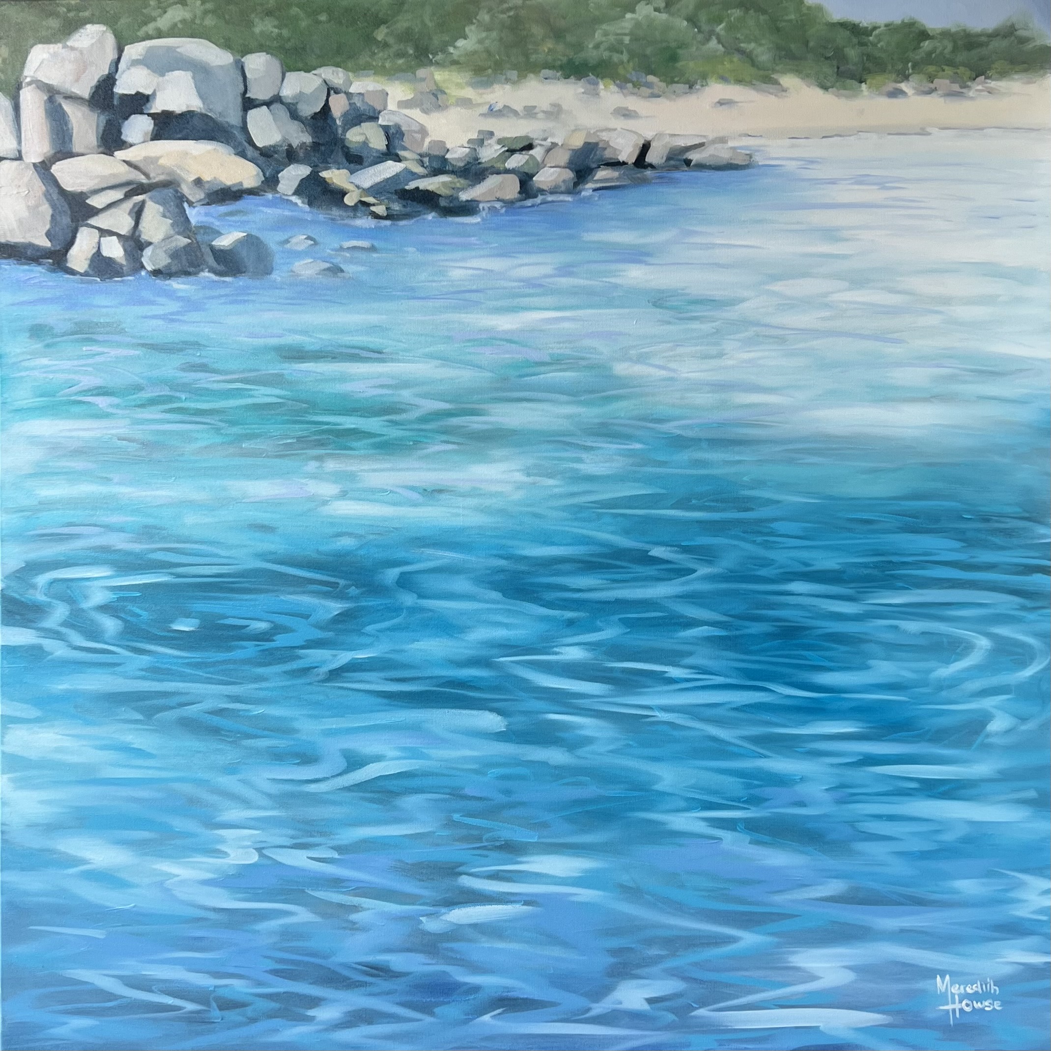 The painting portrays the beach, with emphasis on the crystal-clear turquoise waters. The beach is surrounded by green foliage. The colours used in the painting are a mix of blues, greens, and soft greys, feathered brushstrokes create a dreamy and peaceful ambiance.