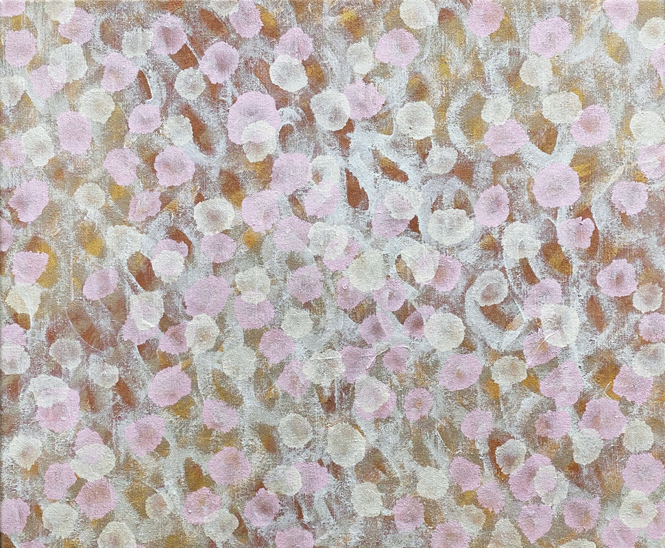In this painting I was thinking about the haphazard patterns that raindrops make on windscreens or concrete pathways and how beautiful this is but also how it connects with biology and cellular patterns on a microscopic slide. It also reminds me of flower petals and blossoms blowing in the breeze. Invisible beautiful moments in nature, under currents, drifts, ebbs and flows. Patterns on a microscopic and macroscopic scale. I find all these things meditative and worthy of contemplation.