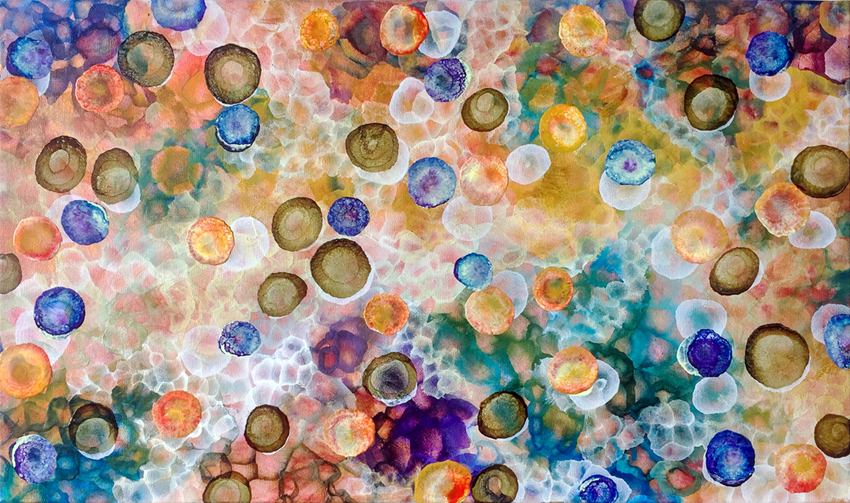 The big. The tiny. The sea. The molecules. The microscopic. These things I think about and look at when I create these paintings. They can be viewed as miniscule cell life just as easily as an underwater garden with floating coral blooms. There is much for the eye to enjoy and explore in the enchanting and highly detailed surface.