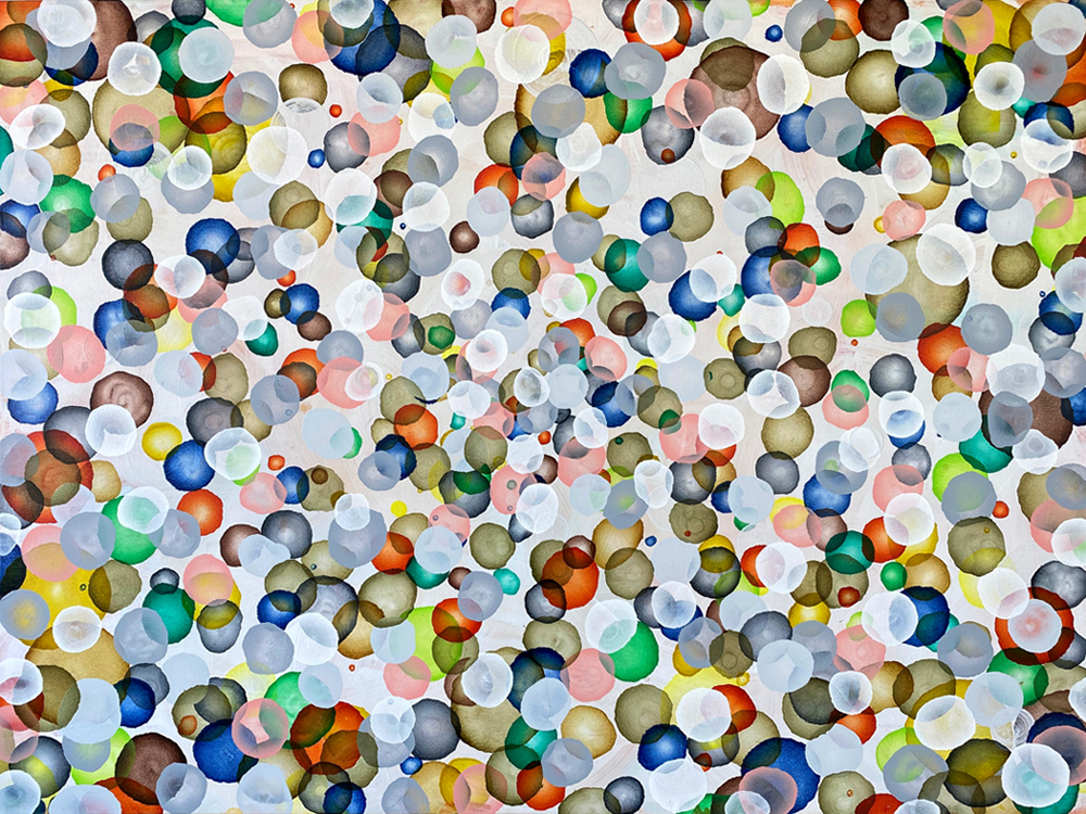 In this painting I am exploring the vastness in the minutiae of life and aquatic themes with all its colour and splendor. The ovoid shapes in the work are placed in an infinite fluid like space reminiscent of deep space or even water, where they drift like migrating jellyfish and dainty microscopic aquatic-life. The organic forms I often use allude to the pulsating patterns of life and the kind of natural universal forms that often stop us in our tracks in awe of their beauty. There is also the inspiration from the beautiful random patterns of raindrops made on surfaces like car windscreens or concrete pathways and how this randomness also connects so perfectly with cellular and molecular patterns.