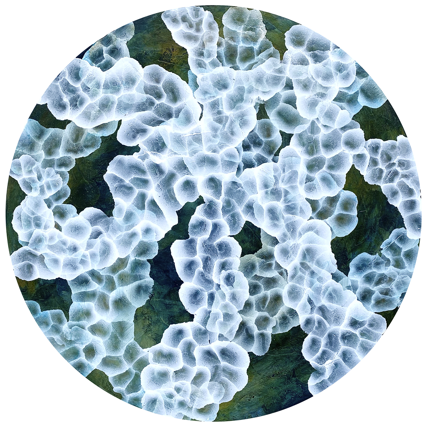 ‘Bio-Sphere Rockpool Bloom’ belongs to my ‘Aqua Vitae’ Series, inspired by microscopic other worlds and aquatic wonderlands. Particularly cell growth, minuscule amoebas, plant life and of course, as I grew up by the sea, I can never escape the otherworldliness of underwater sea life such as coral, algae blooms, seaweed growth and all things rock-pool. The shapes I have used and their arrangement are intended to form visual intrigue moving in and out of focus and relating to our memories of these things in nature. There is an underlying texture and subtle tonal shifts in the background that give the piece a glow and deep space.