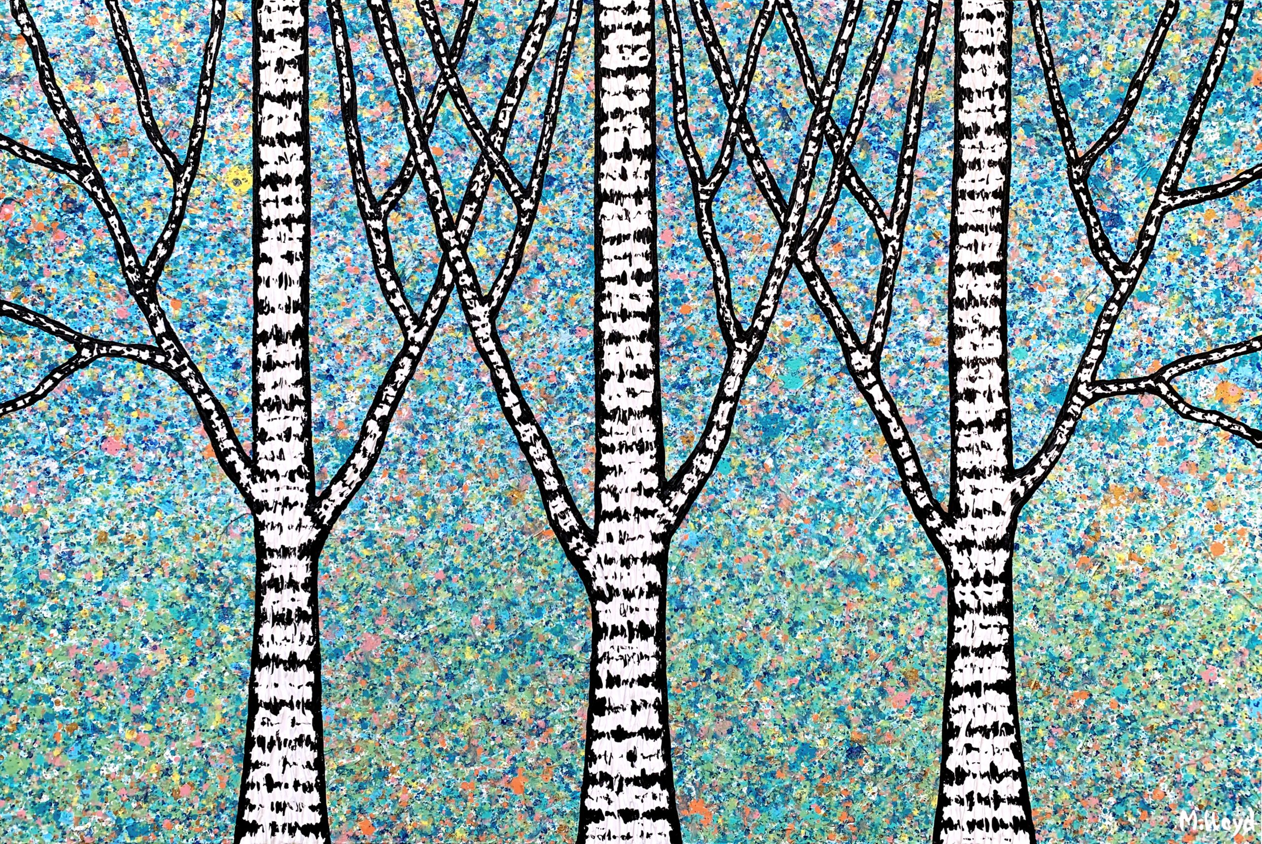 For the nature lovers! These are one of my own favourite paintings as very striking but also cool and calm. Inspired by my own backyard in the Adelaide Hills and also my memories of my grandmas place as a kid. I loved the fuzzy flowers we used to crumble up and use in our mud pies. Now they become an issue when I paint outside during the months they float away from the tree and end up in my paintings but still love them. Or drop a heavy branch when gardening and even painting as I splatter on my lawn. Wanted to create a contrast with these trees to their background for a dramatic effect. The background has a light texture and the trunks have heavy textures. Background has a mix of blues, greens, pinks, golds, whites. Finished with a satin varnish. The close ups show their colours and textures better. Its hard to capture its real textures in photos. Painted around the edges ready to hang.