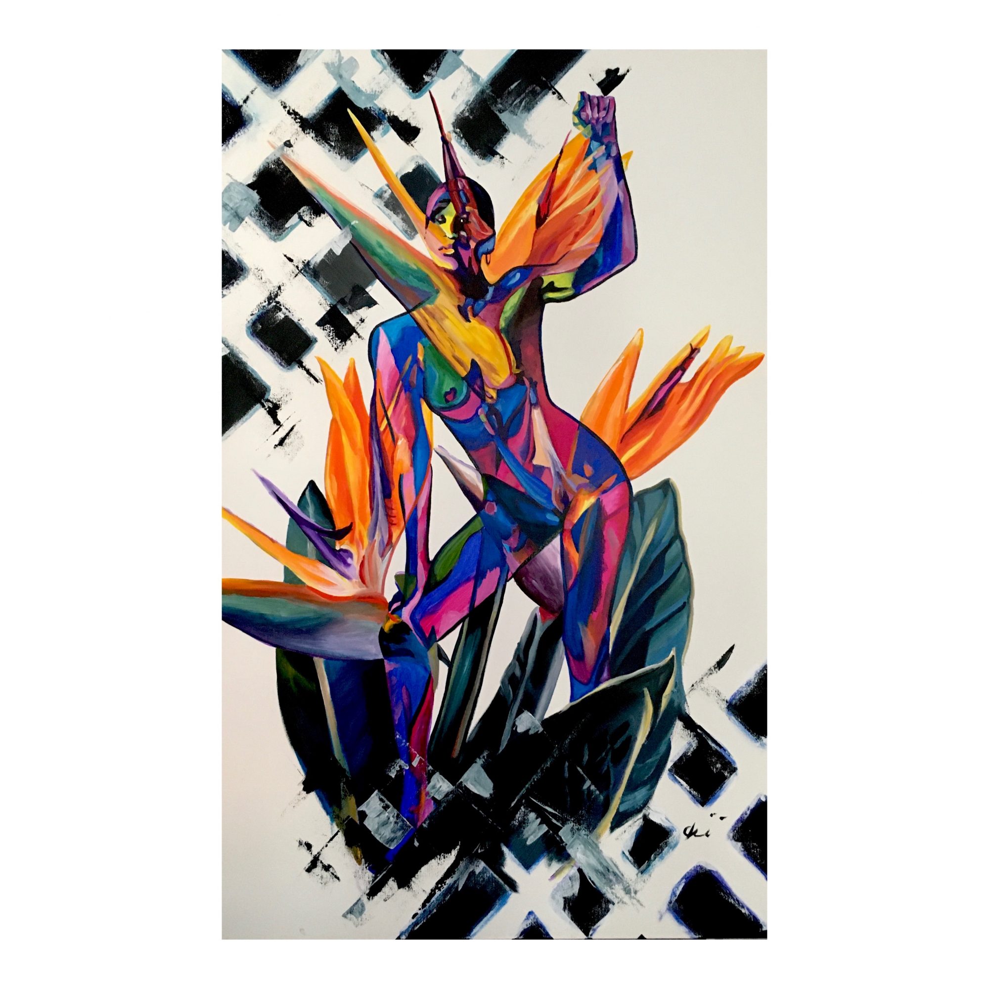 So what experience would I like you the observer to have? Â Well, imagine walking into a room and being immediately captivated by rich colour and shapes that appear to be flowers. Â After a few seconds you tilt your head slightly, “is that a figure in there?” Â You surge closer eagerly sensing the hint of something more. Â The intertwining images spark your curiosity and desire for closer inspection. Â Standing immediately before it, your eyes begin to wander endlessly over intermingled curves and lines. The mind pieces together what it is seeing. The colour combinations make your visual senses sing. Â You begin to smile as you discover the line of a human curve or is it the petal of a flower? Â Of course at this point you realise you are way too close to take it all in. Â Here begins a slow deliberate retreat until the perfect vantage point is reached. The observational journey is complete. Â There she is – a beautiful lady nestled within nature’s majestic flowers. Â She knows you are now captivated and permanently under her spell. Â You will, consciously at first, then subconsciously, continue to glance at her every day for the rest of your life. She will return your favours by gently imprinting her own beauty and stillness into your mind. Â As you rush out the door, she hopes you will notice more moments like this as you are swept away into your busy day. Â In quiet times she will be your quiet companion while you take a moment to enjoy some peace and solitude. Â This is the glorious luxury of being surrounded by beautiful art.