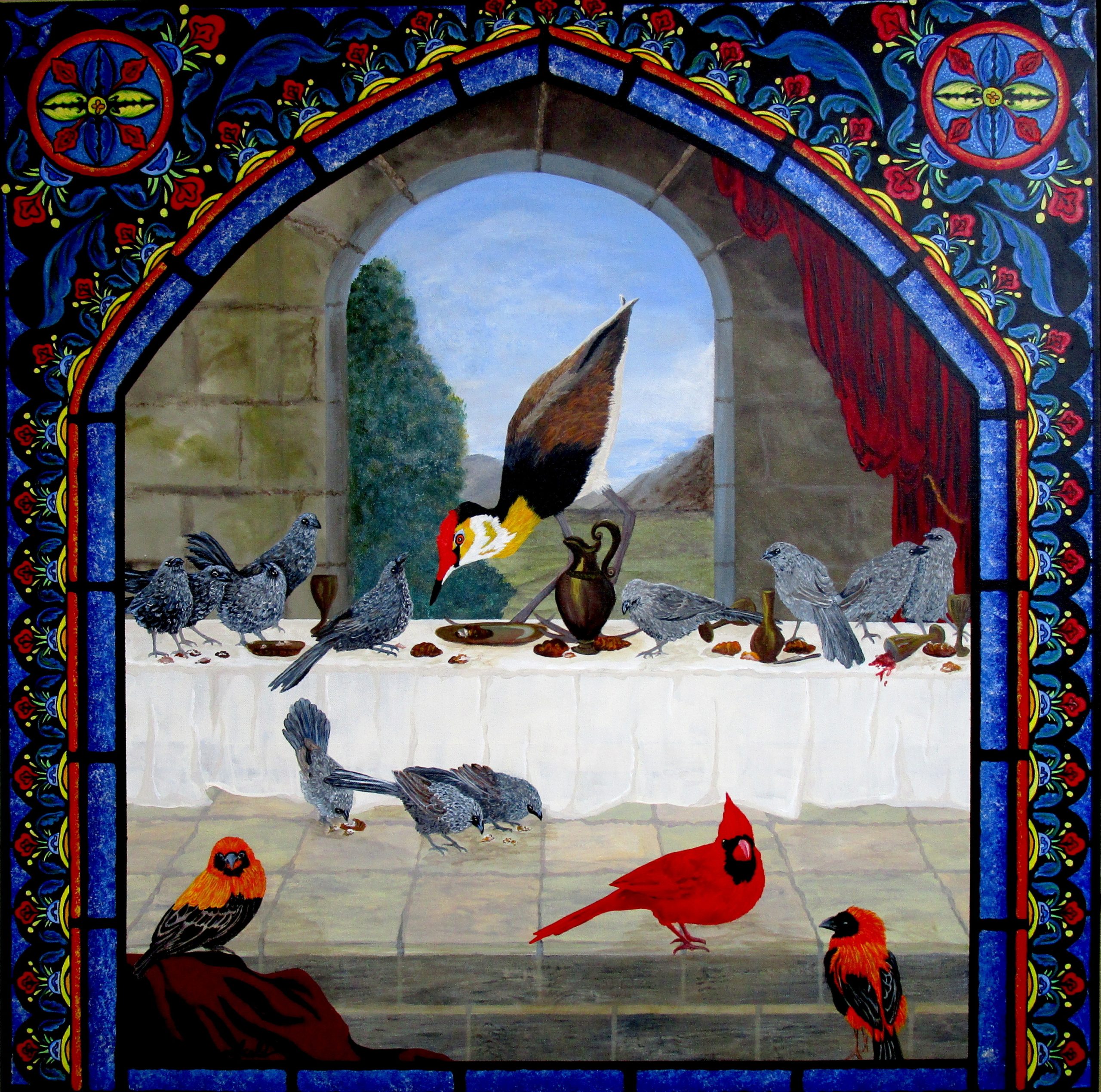 I decided to create an image of these birds in a religious setting and doing my own quirky version of “The Last Supper” within a stained glass window.