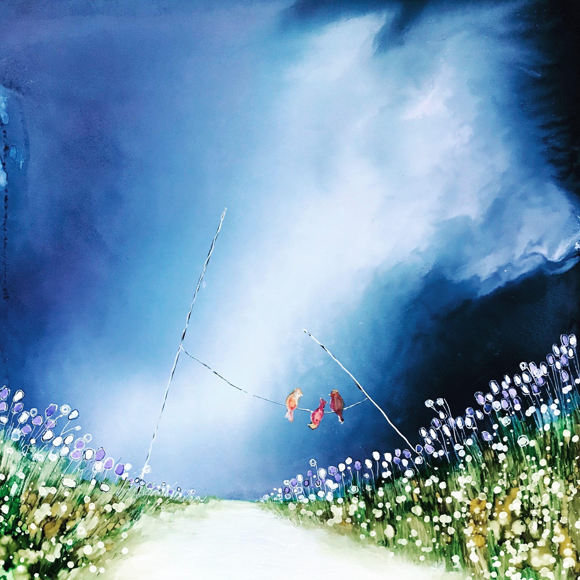 Ethereal painting. Three little birds, just talking about the morning and how big and juicy the worms are. The best things in life are there for free, we just need to to open our eyes.