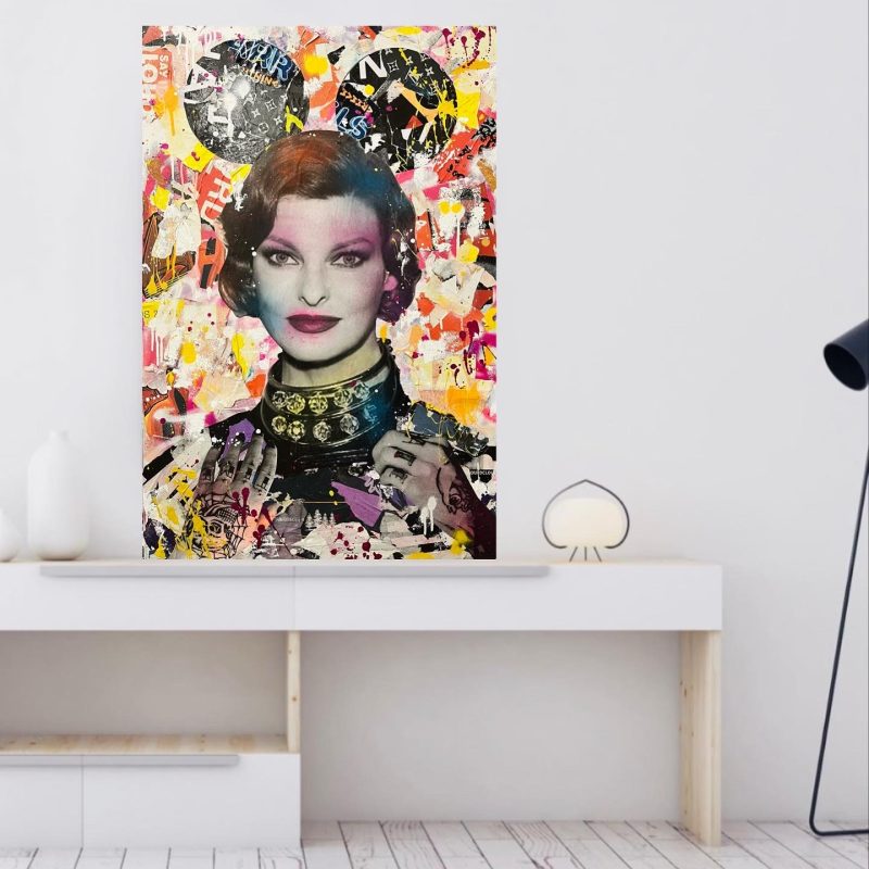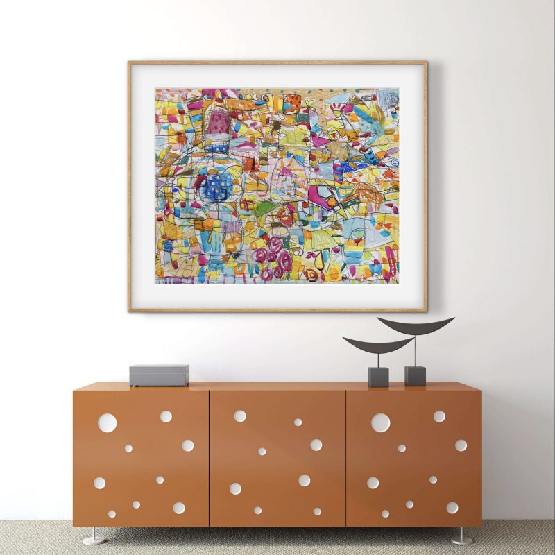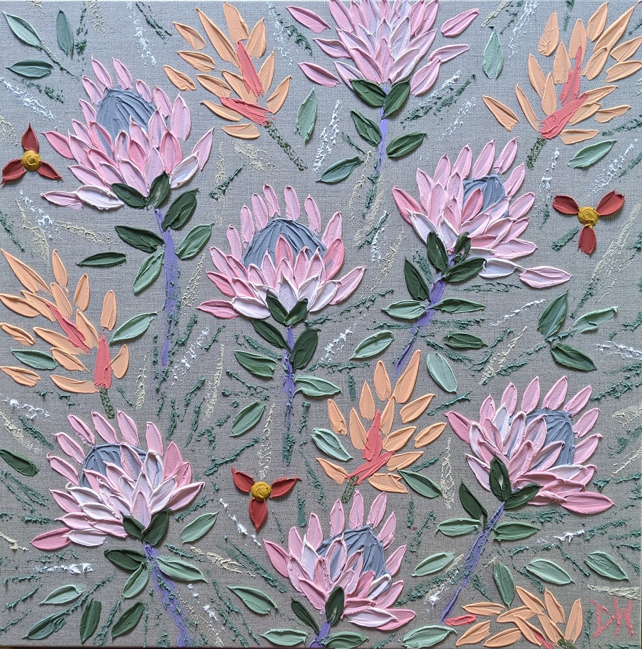 Highly textured impasto king protea flowers painted on Belgium linen.
