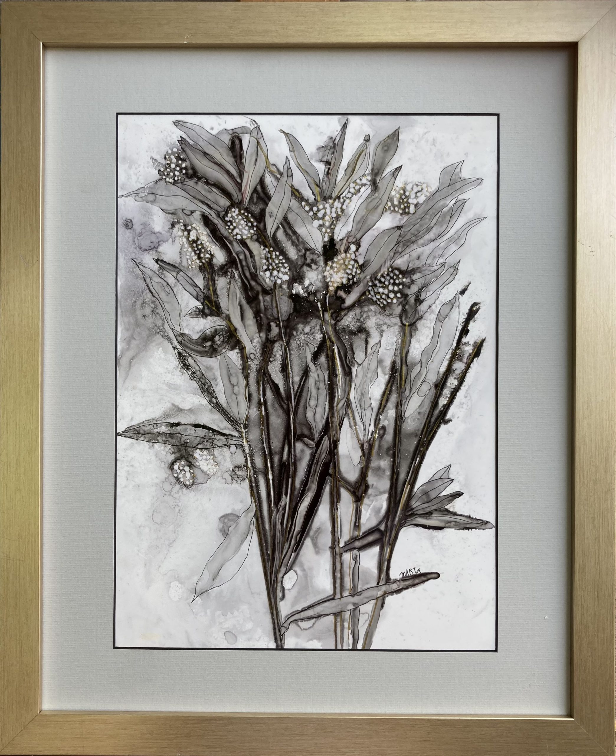 Black and White is a small semi-abstract original ink painting on 28cm x 36cm Yupo Paper. It is framed with a recycled 37cm x 47cm gold coloured timber frame. The painting is protected by Perspex for safe shipping.  I has a hanging wire attached to the back so it can be hung immediately. Different framing can be organised by Art Lovers.