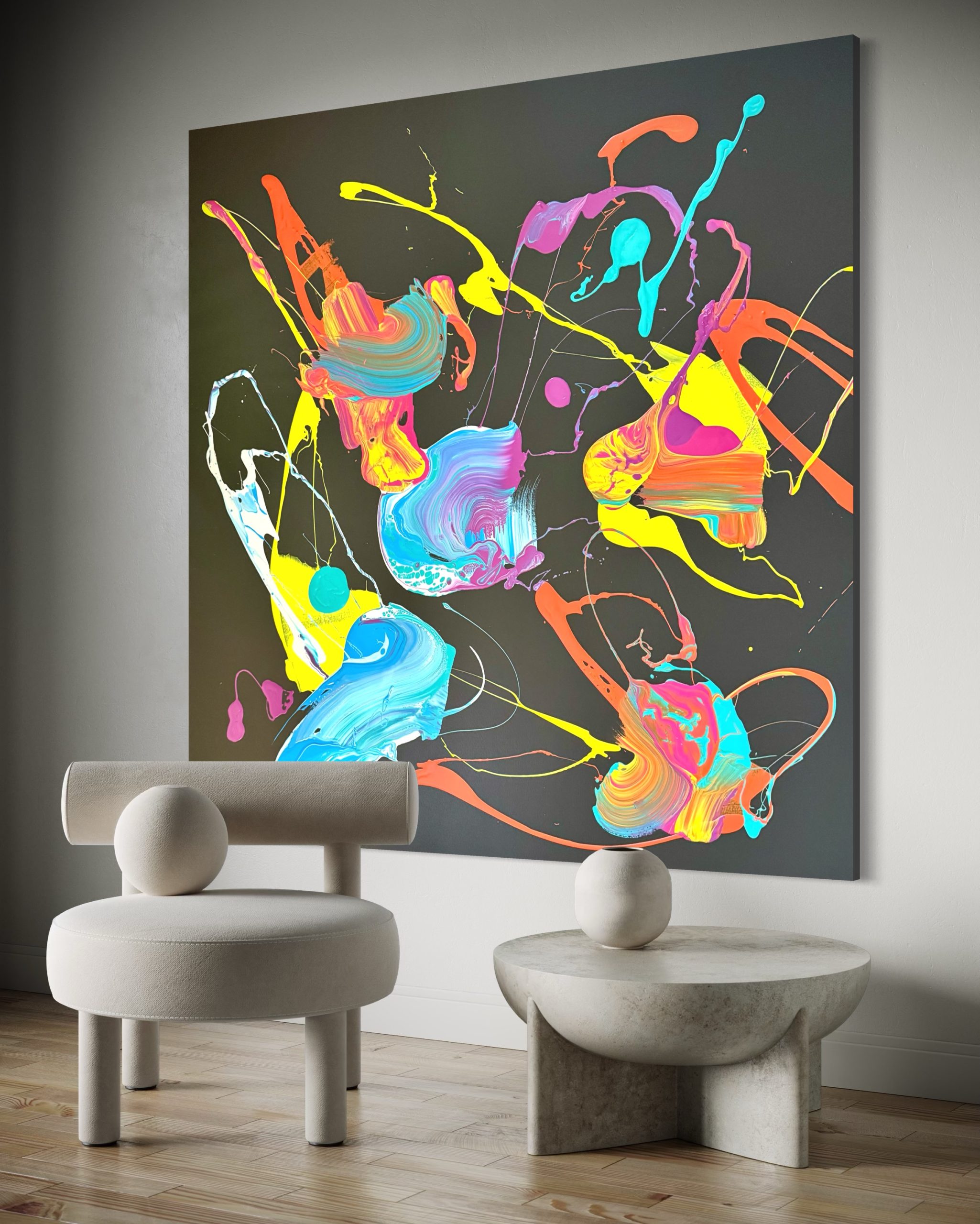 My new piece titled “Black Caviar “ displays a lively burst of colour on a dark background this artwork captures the fluidity and joy of vibrant abstract forms with playful floral swirls.