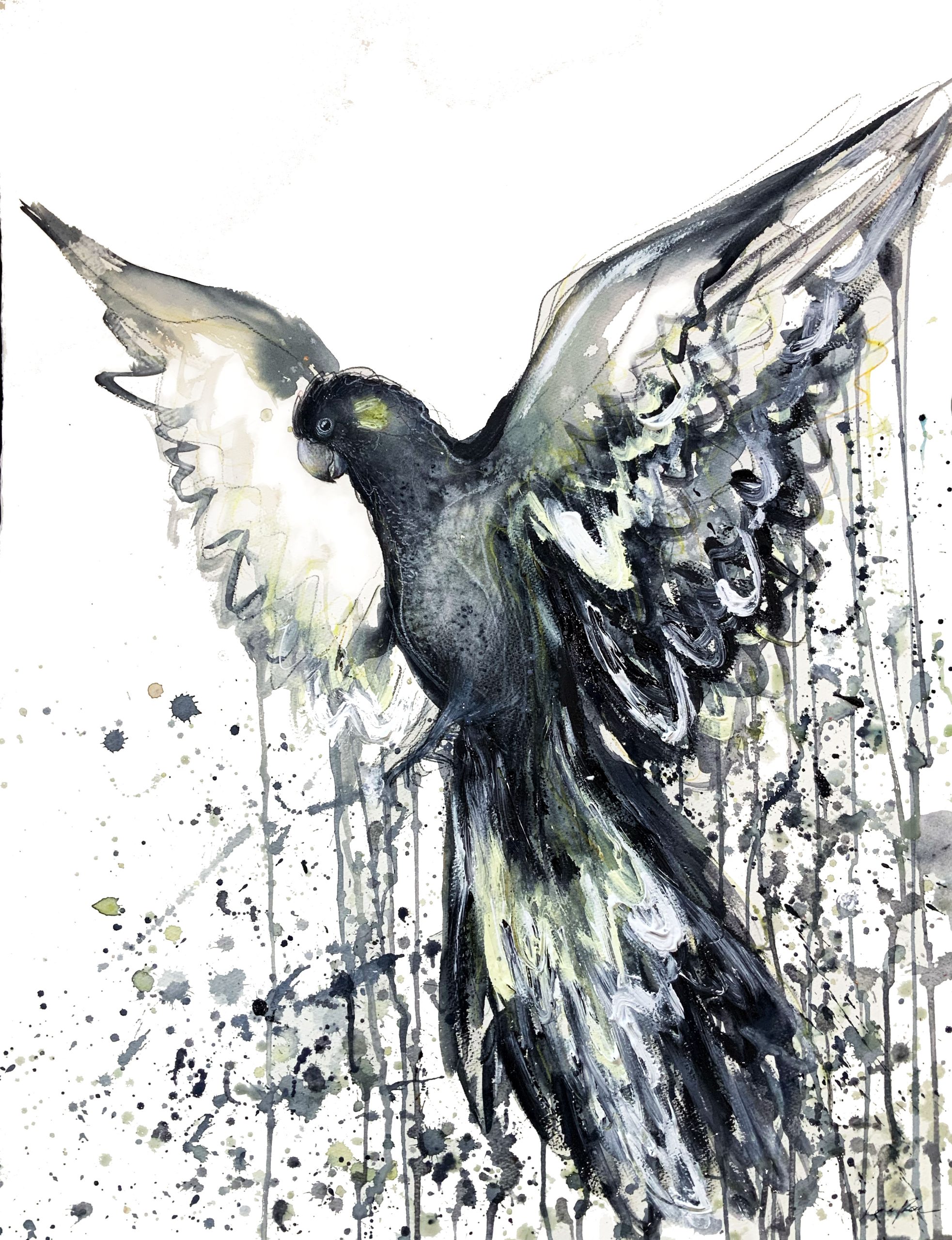 In this original painting by Sydney artist Leni Kae, the Black Cockatoo symbolises spiritual joy, strength and confidence. Following it’s call to the spirit means finding your way to a renewed sense of creative being, authenticity, and ultimately self-empowerment. The Australian native bird is pictured flying with outstretched wings, symbolic of reaching new heights. Black and indigo tones portray definitive strength, with highlights of yellow and soft coral tones symbolic of a joyful spirit.
