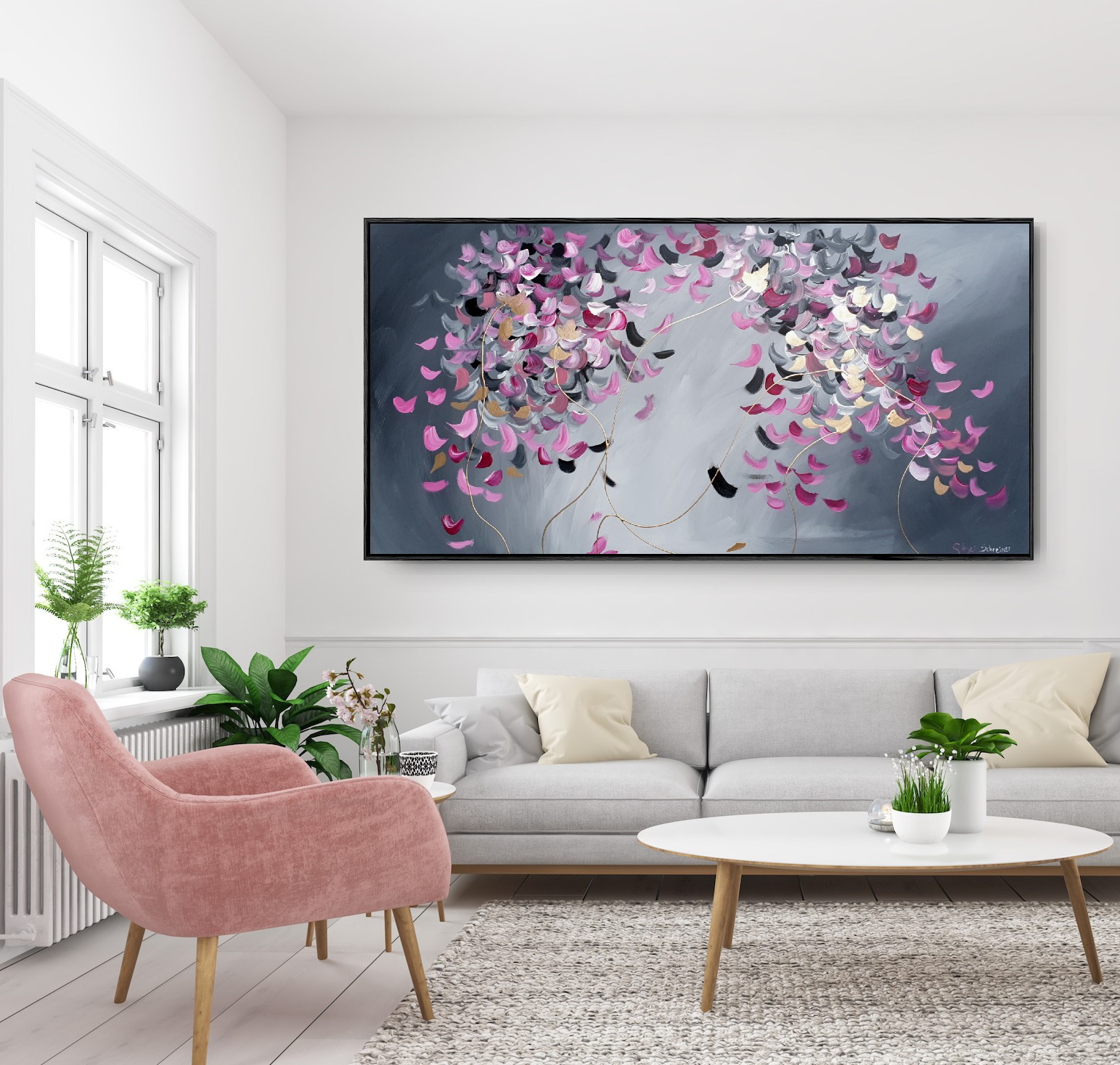 The painting does’t come with the external frame. The images attached are representations of what it could look like after being framed. No hanging wire.
