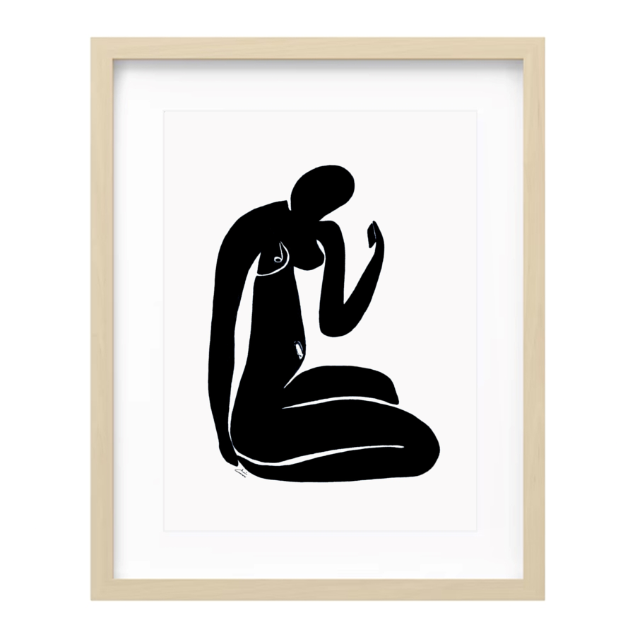 Black Nude Selfie I by Chris Cox – The Black Nude series are a collection of abstract figures in the style of the abstract master Henry Matisse. The series aim to capture the everyday moments in a simple effective way through the use of body movements and mobile technology, whilst providing an original abstract figurative piece that will compliment the collectors home or office space. Refecting the inhabitants of living space is a core motive for the design of the work and is an original piece of art painted in Acrylic on 300gsm fine art paper. Box Framed by Chris Cox Art studio.
