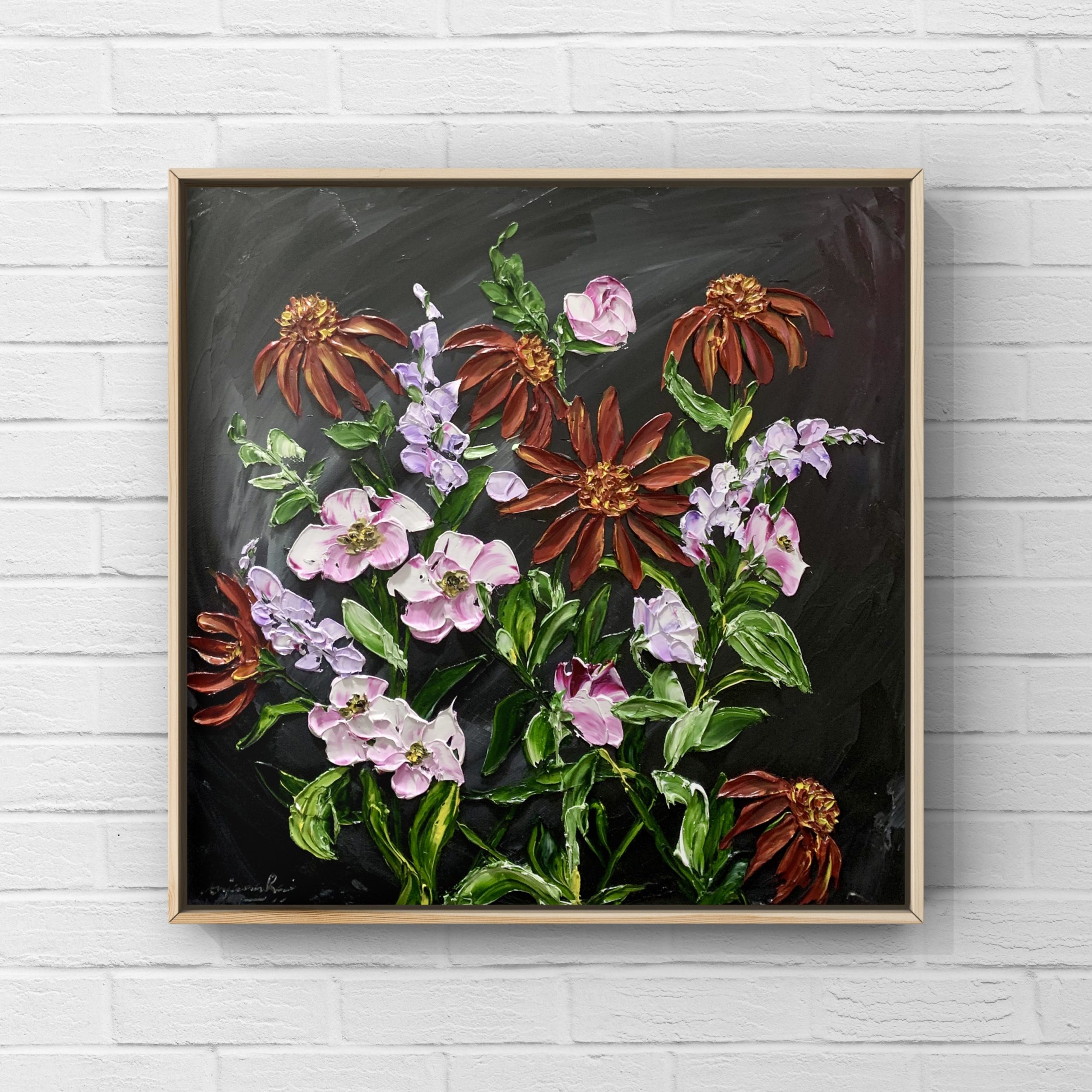 Black- Original artwork by Anjana Rai. This floral artwork is made using impasto technique with palette knife using thick textured layers of oil paint on deep edges stretched canvas, framed in natural wood floater frame, with wire across to hang.