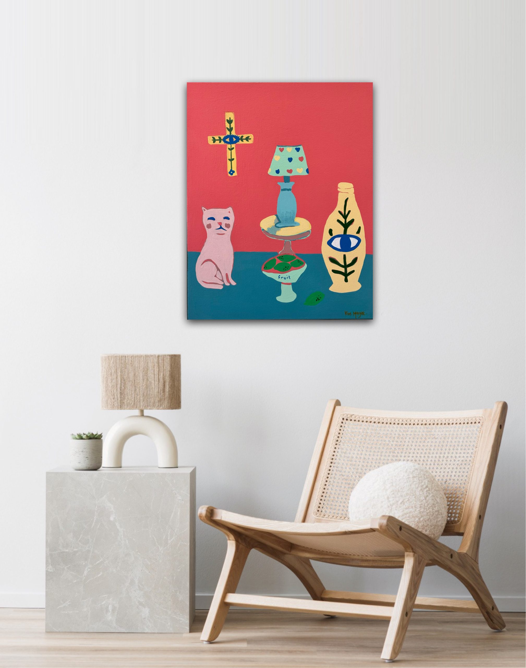 “Blessed Be The Fruit” is a whimsical still life bursting with charm and colour. Featuring a pink cat, a pedestal of fruit, and symbolic motifs like the protective eye and cross, this playful piece blends folk art with a touch of humour. A celebration of abundance, guardianship, and quirky home life.