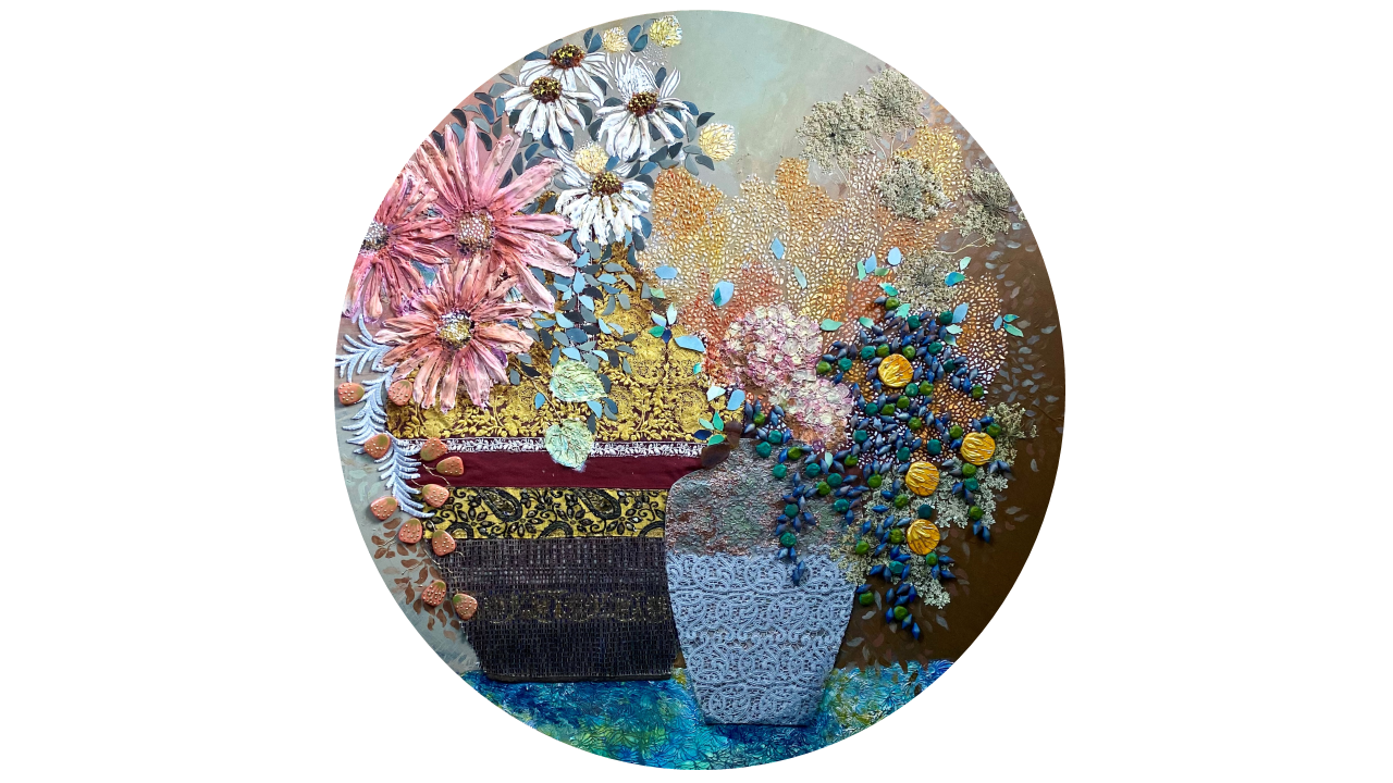 It is a mixed media floral painting on a circular canvas that celebrates the vibrant beauty of nature through texture and color. The piece features two flower vases filled with multicolored blooms, each petal and stem crafted with layers of texture to bring the flowers to life. Using a combination of acrylics, texture paste, and other mixed media elements, I aimed to create a tactile experience that invites the viewer to feel the richness of the flowers as they burst from the canvas.