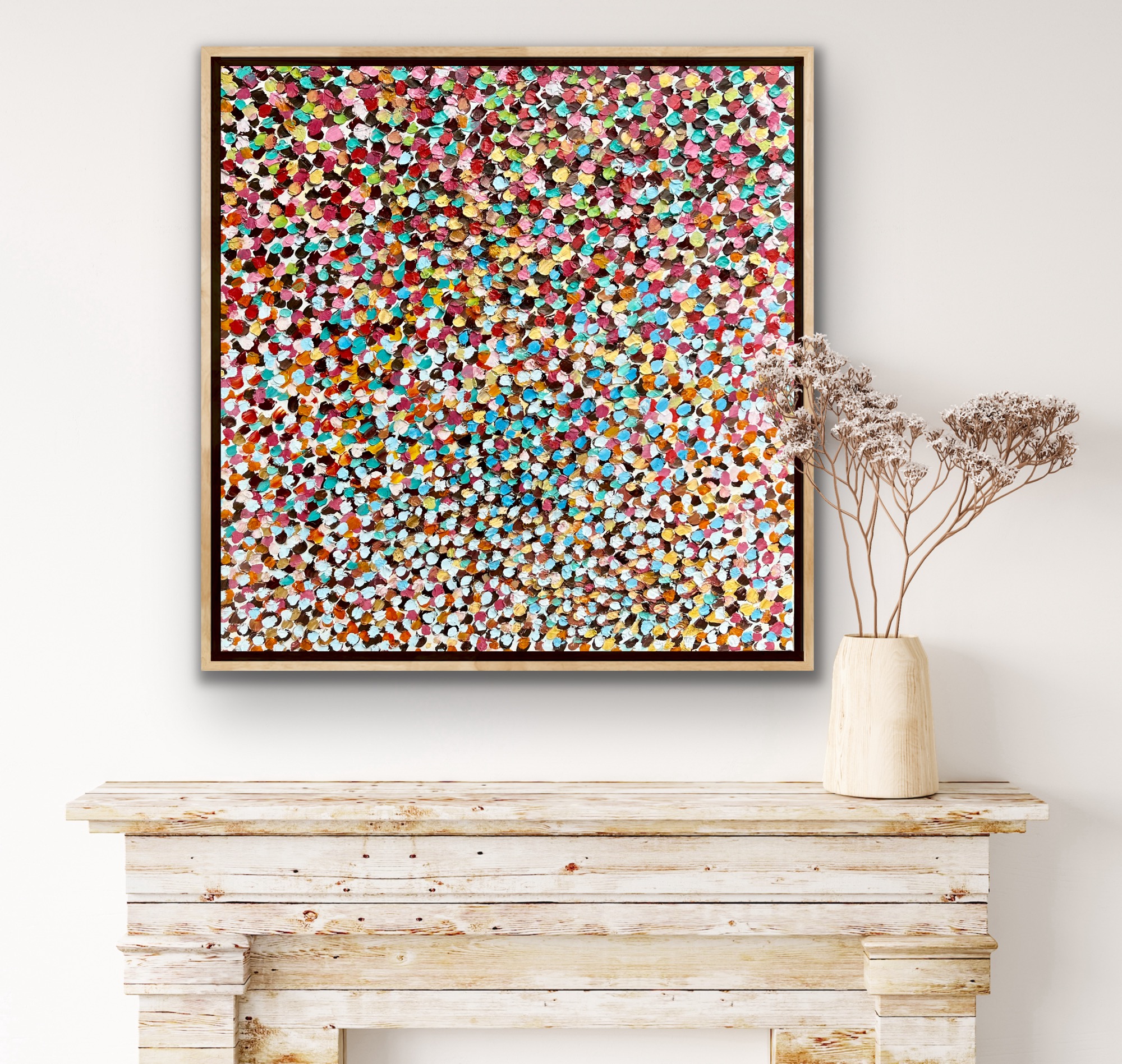 Blessings of Love of by Theo Papathomas –  a painting of beautiful petals weeping on to the landscape. Petals are painted in thick rich oil paints with a pallet knife and brush to capture the richness of the colours of the petals and to give a lot of depth to the painting. Weeping petals from the forest creating a veil of colours, dancing over the land .Hope with this work makes the viewer feel very peaceful and tranquil. This painting does not come with an external frame.This painting is signed and dated 2022 at the back of the painting and comes with a certificate of Authenticity.