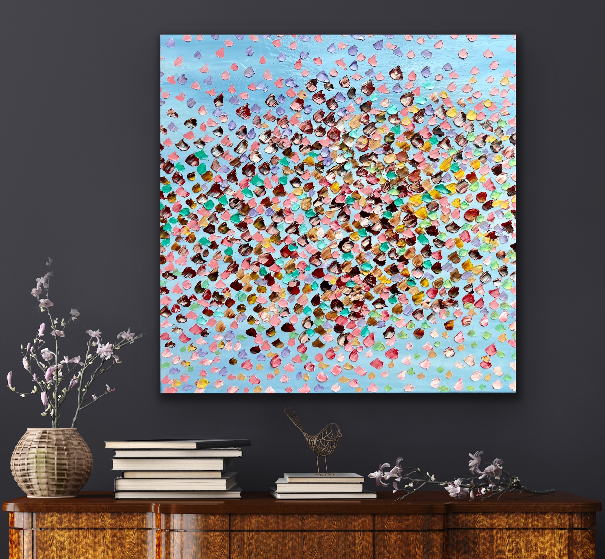 Blessings by Theo Papathomas  a veil of petals covering the beautiful blue sky with thick oil paints to capture the textures of the petals. The painting is painted with a pallet knife to create a lot of depth in the painting .I used the beautiful emerald green colours to capture the leaves and playing with warm and cool colours . A very textured painting with so much depth by creating lots of layers of paint giving it a three dimensional feel .Weeping petals swept by the winds creating this musical Bouquet in the sky. Every petal represents a blessing from the Sky. Hope this painting makes the viewer feel peaceful and tranquil.The painting is signed and dated 2021 at the back and comes with a certificate of Authenticity.