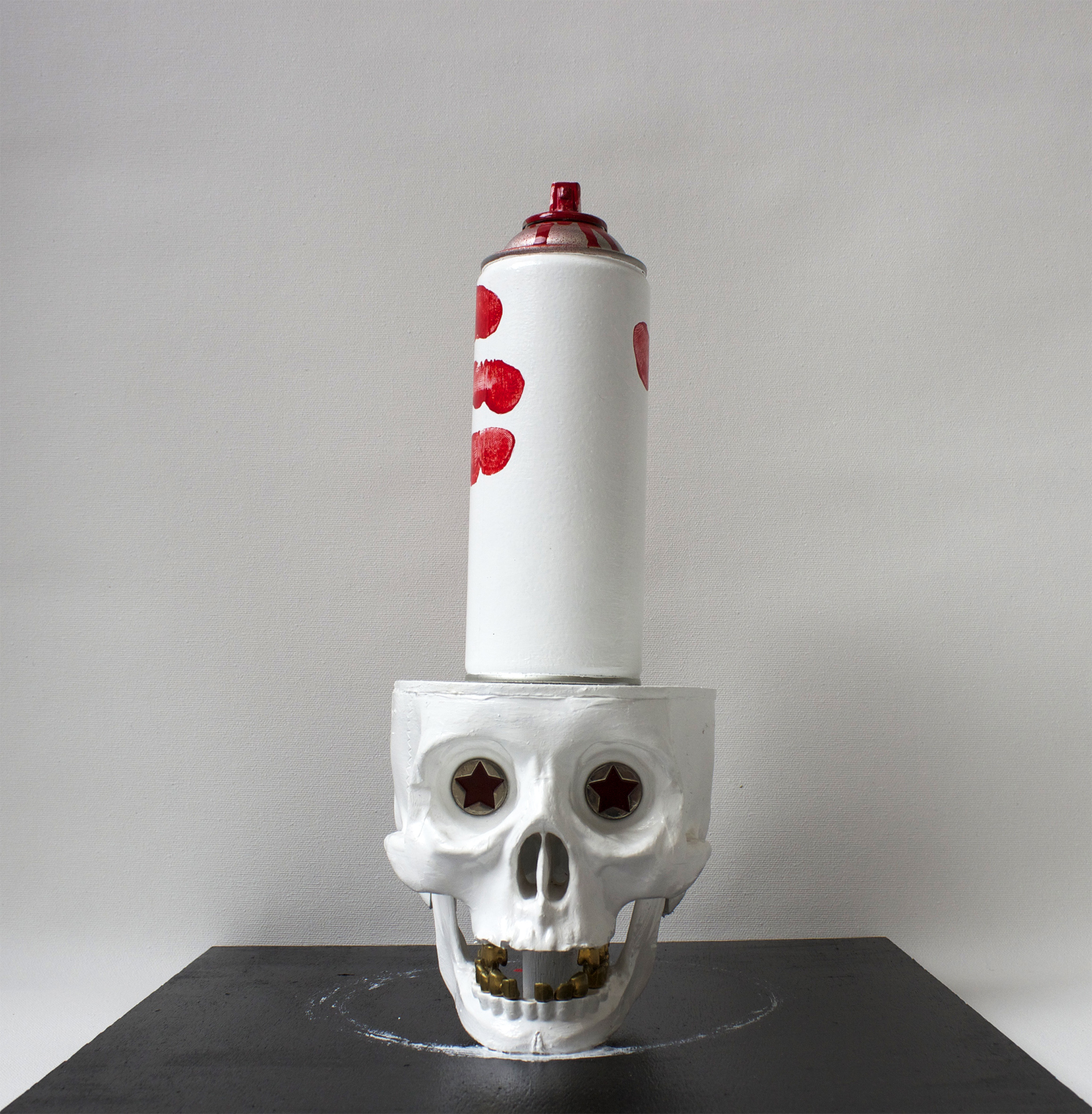 Acrylic, spray enamel, plastic skull, ply wood and spray can on marine ply