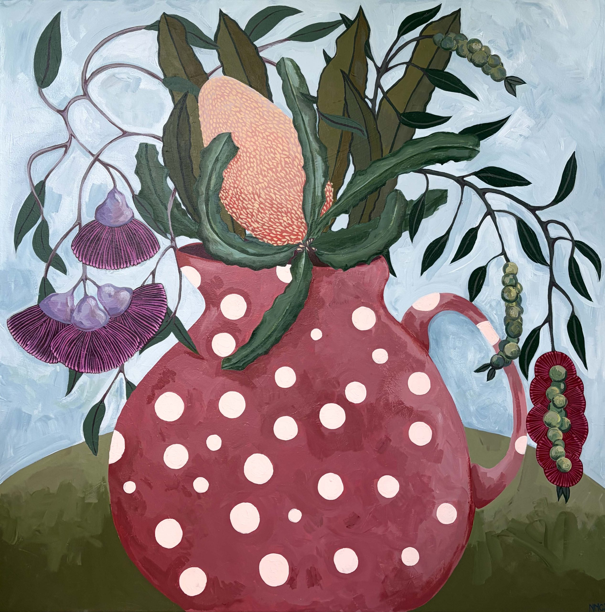 A large still life with a quirky spotted jug holding a beautiful banksia sourrounded by leaves, bottlebrush and flowering gums. It is painted in an expressive way with texture and direct brushmarks. As with all my still life works I like to play around with objects from life and from my imagination, this jug is the latter. A bit wonky and filled with a deep pinky-red contrasting with the greens and blues elsewhere while accentuating the pinks and reds in the flowers.