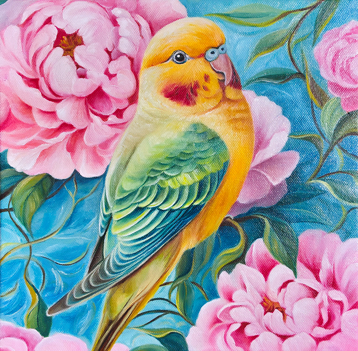 Nestled among lush, blooming peonies, this sweet little budgie feels like the quiet guardian of its own secret garden. Painted in oils with soft layering and vibrant colour, the piece celebrates the tenderness found in nature — those small, peaceful moments where beauty simply rests and glows.