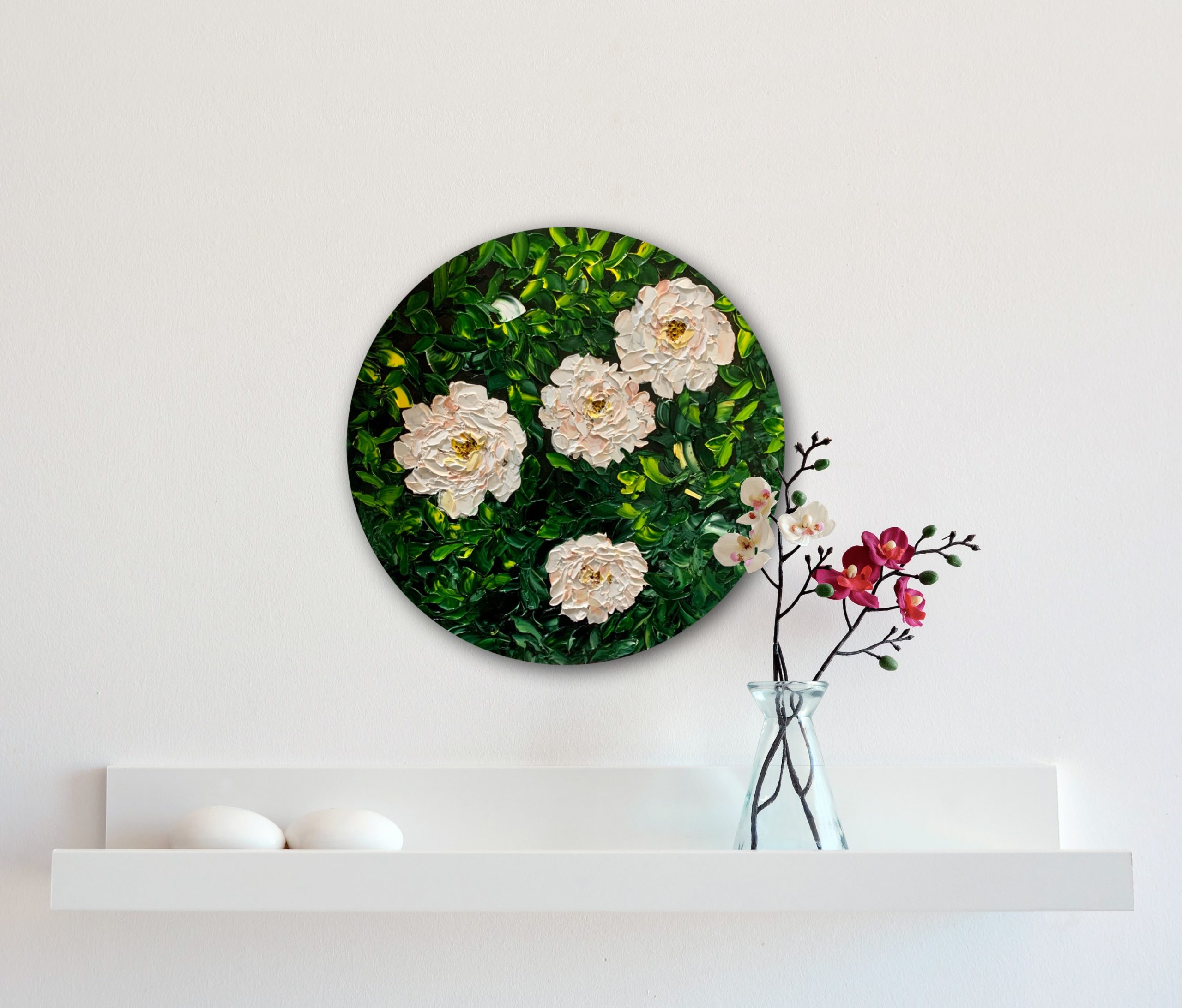This artwork is made using impasto technique with palette knife on circular wooden panel, with wire across to hang.