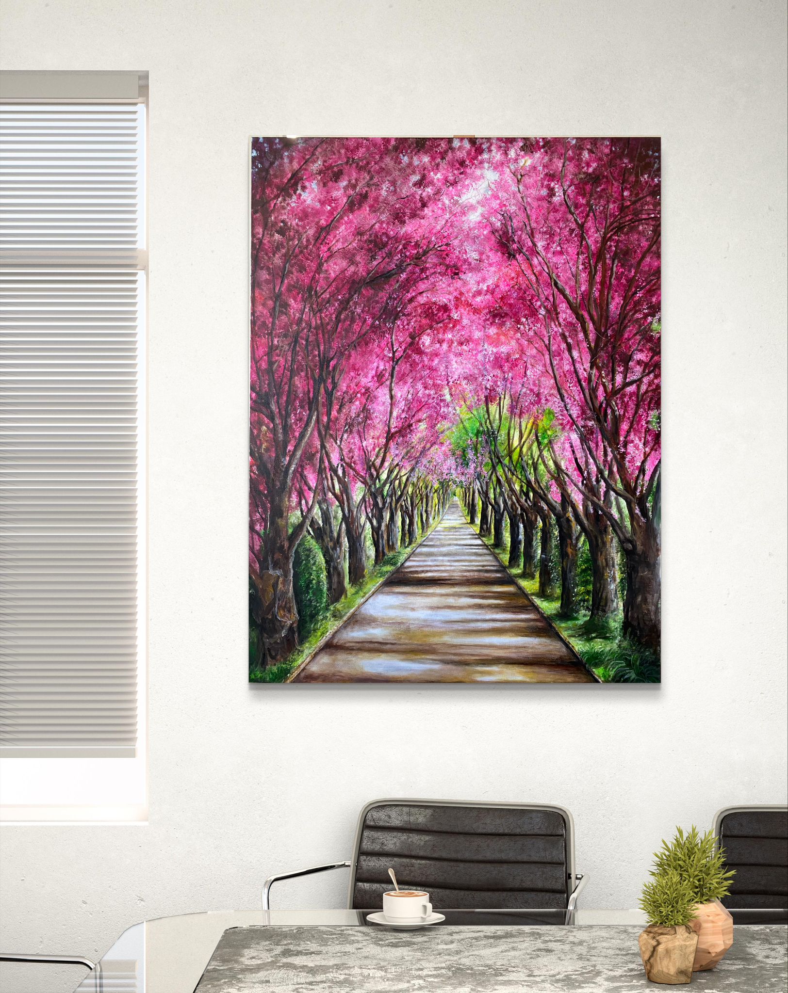 This oil painting would emphasize the contrast between the magenta blooms and the earthy, natural tones of the landscape, creating a vibrant yet peaceful scene.