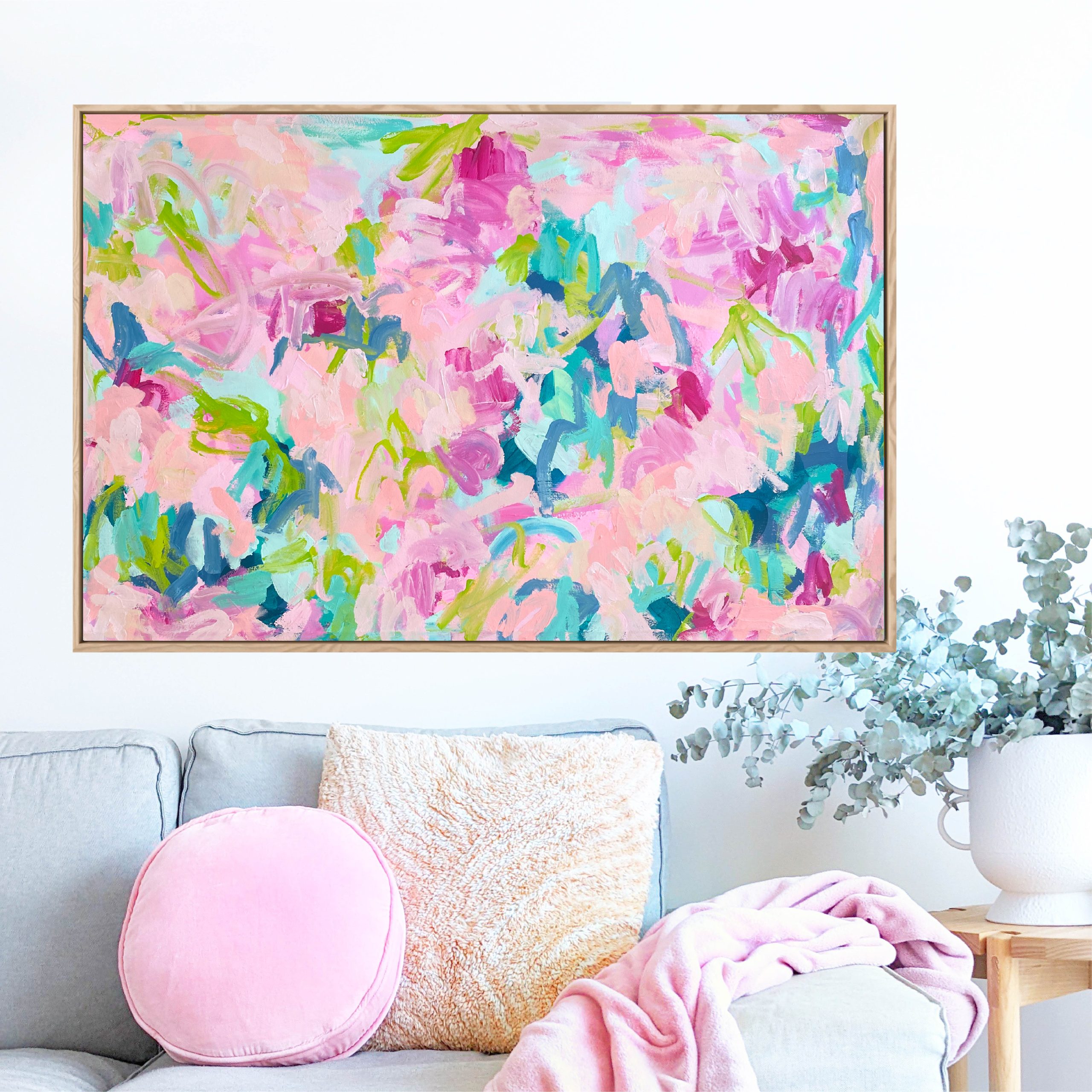 Acrylic on hand stretched canvas framed in an Oak floating frame.