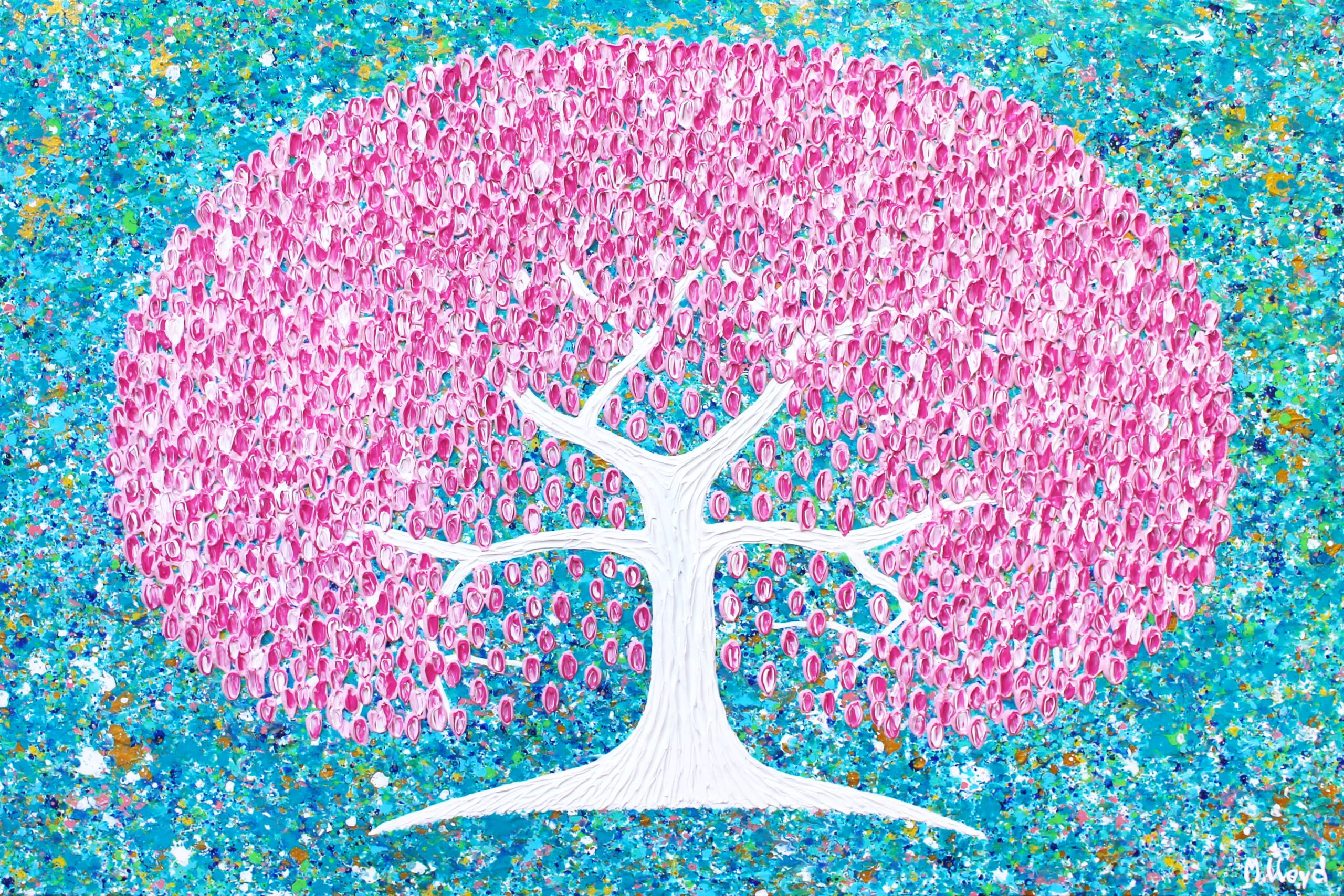 Blossom Tree Spring Garden by Miranda Lloyd – This is a new version of my Blossom Tree adding some sunny yellow highlights to the coastal blue background. This painting is inspired by my love for everything floral and nature. Combining my two favourite colours together coastal blues and marshmallow magenta pinks. Trees have always been my signature. This one says “SPRING TIME” as I love the fruit trees bursting in blossom in the Hills. Background is textured with a textural tree and individually applied blossom flowers. The background is of greeny blues, sky blues, deep blues, turquoise, whites, pinks, yellow, greens and metallic golds. Painted around edges with a satin finish. The painting looks much better in real life as very hard to photograph the blossom textures. The tree bark is super textural too that doesnt show well in the photo.